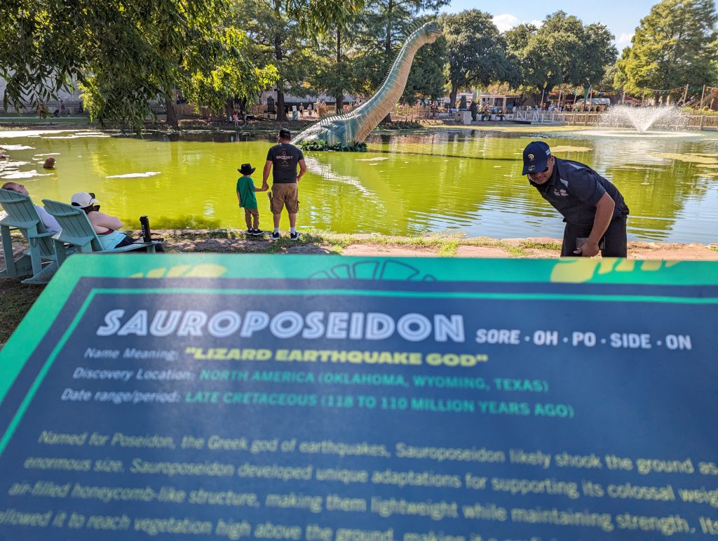 • We pass a park full of dinosaur statues, one of which is called “Sauroposeidon” with translation Lizard-Earthquake-God. Julian: “Yeah yeah, the God has 50 jurisdictions and this is number 49.”