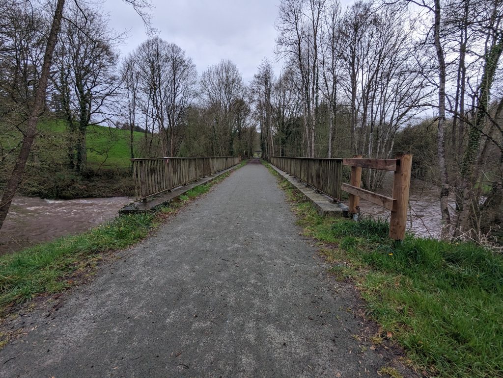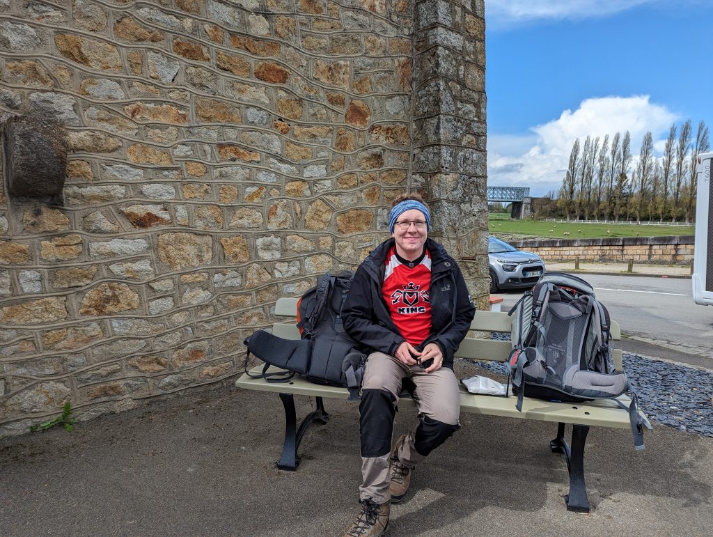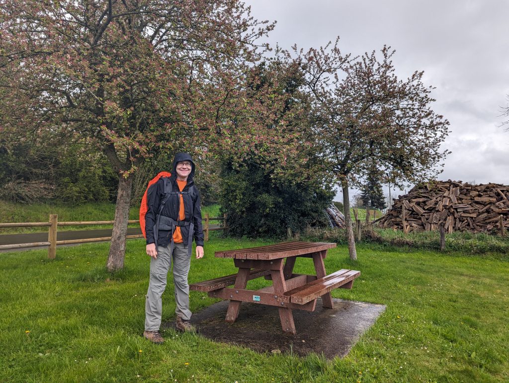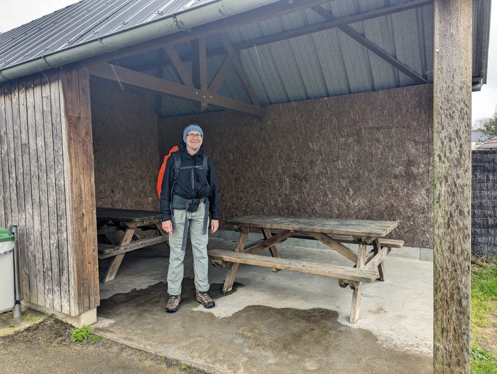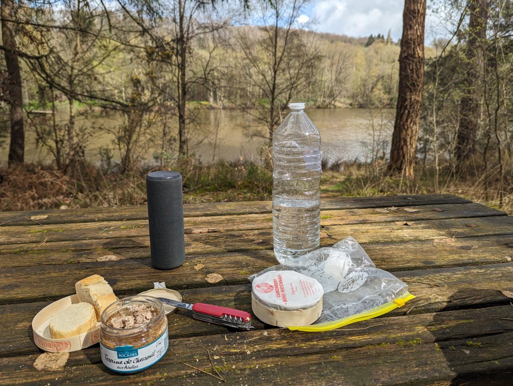• For our break we look for a table, which we find (a bit of a surprise on the Voie Verte), but without a roof, which is a bit uncomfortable as it’s been drizzling all day.
