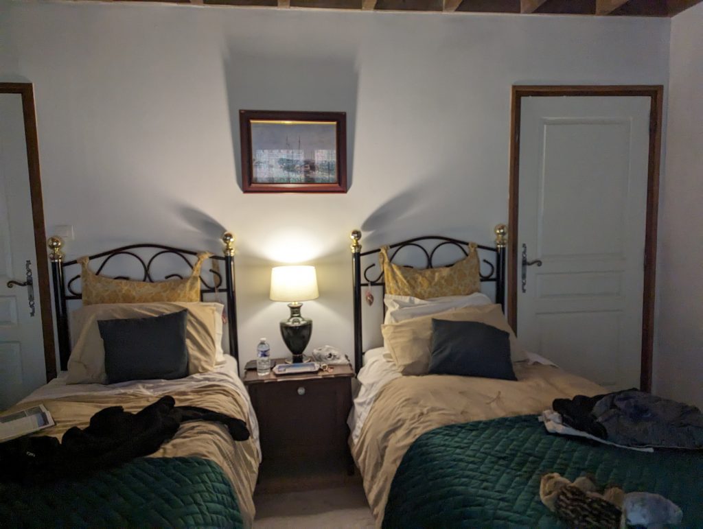 • Our accommodation today describes itself as a ‘tranquil oasis’ and the name says it all: it is more remote than our house in the Waldviertel. We reach a village via small and ever smaller roads, which we leave behind us, and finally we see a sign ‘La Chevallerie’ in the middle of the meadow – ‘Ah, there it is!’ exclaims MatthĂ€us with relief, as we had been wondering whether there were any more houses here at all, and we turn into the driveway that leads to a beautiful old house with an Irish flag flying in front of it.