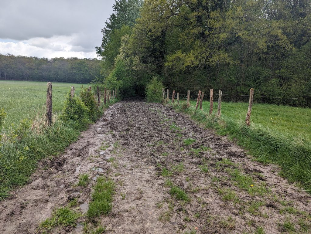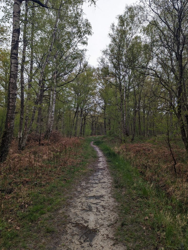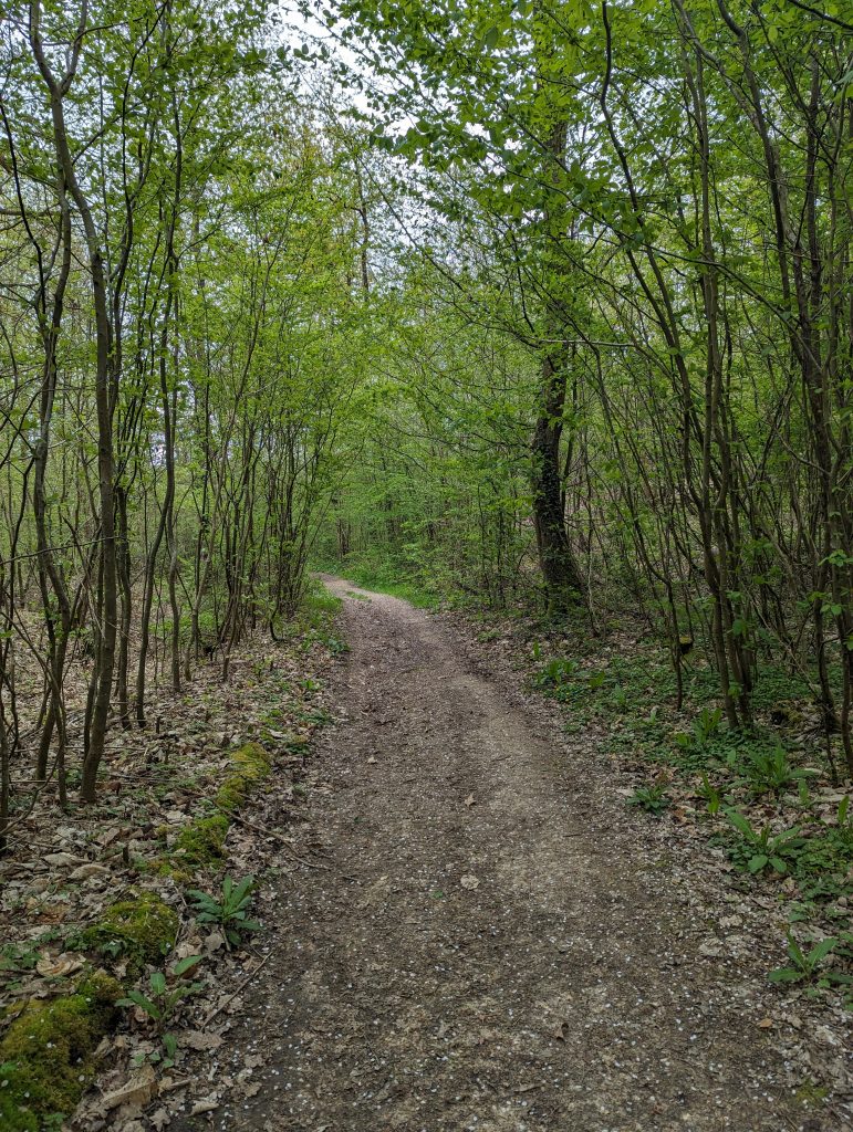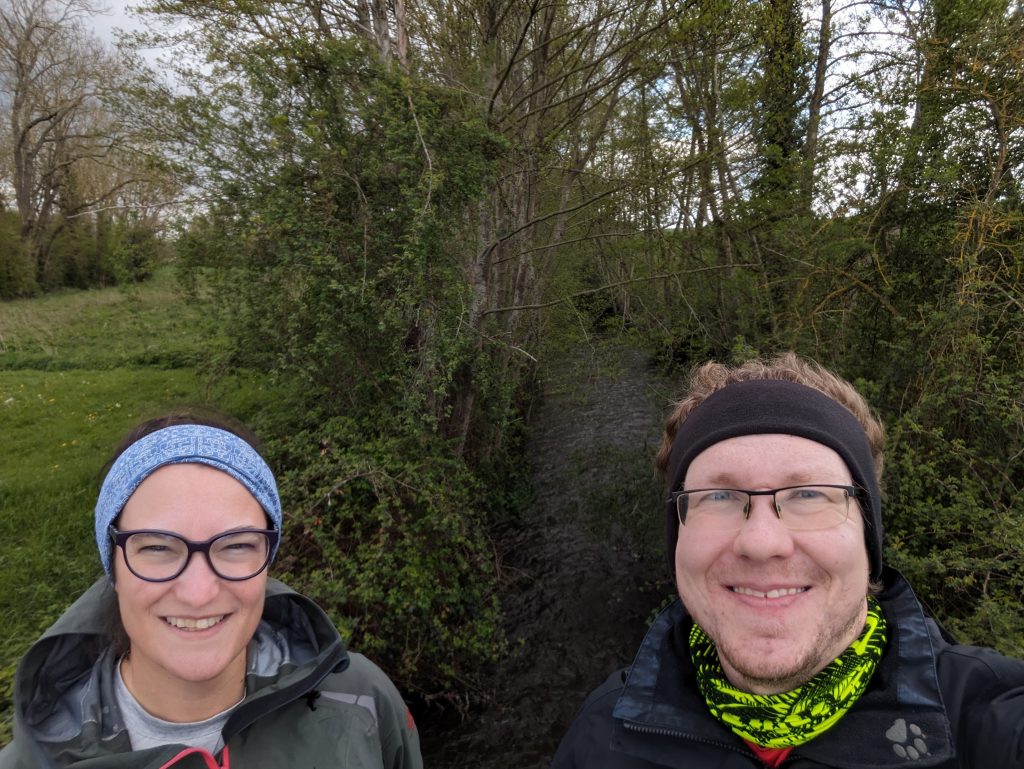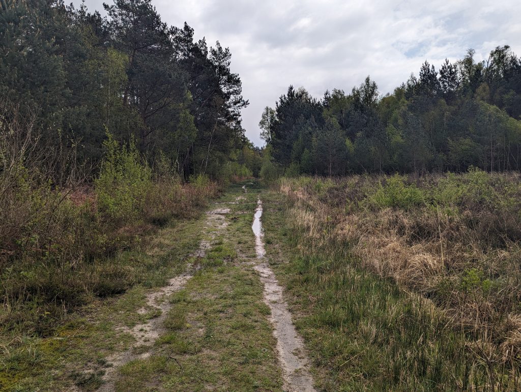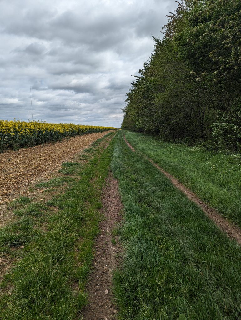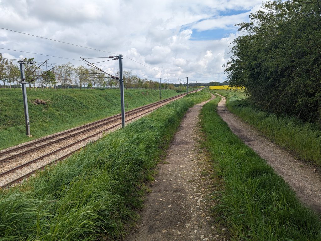 - In real April weather, we finally start our stage across fields and along a railway line, following our own intuition (always a good idea) and taking the dirt track instead of the road, which forces us to make our way through the thicket in the forest at the end.