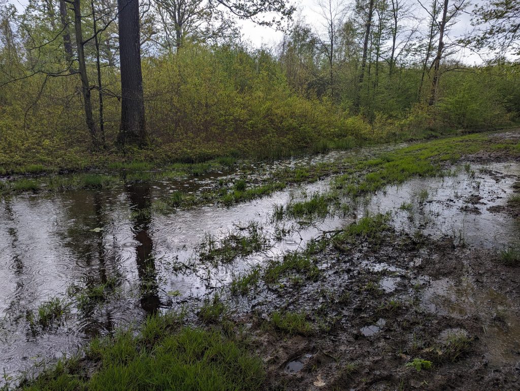 - Eventually our path leads into the forest and becomes increasingly muddy, almost swampy in places, turning into lake-like conditions.