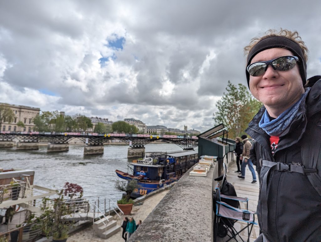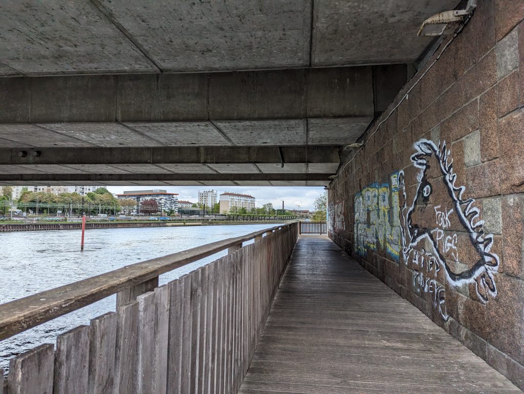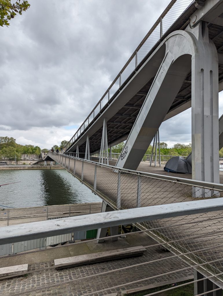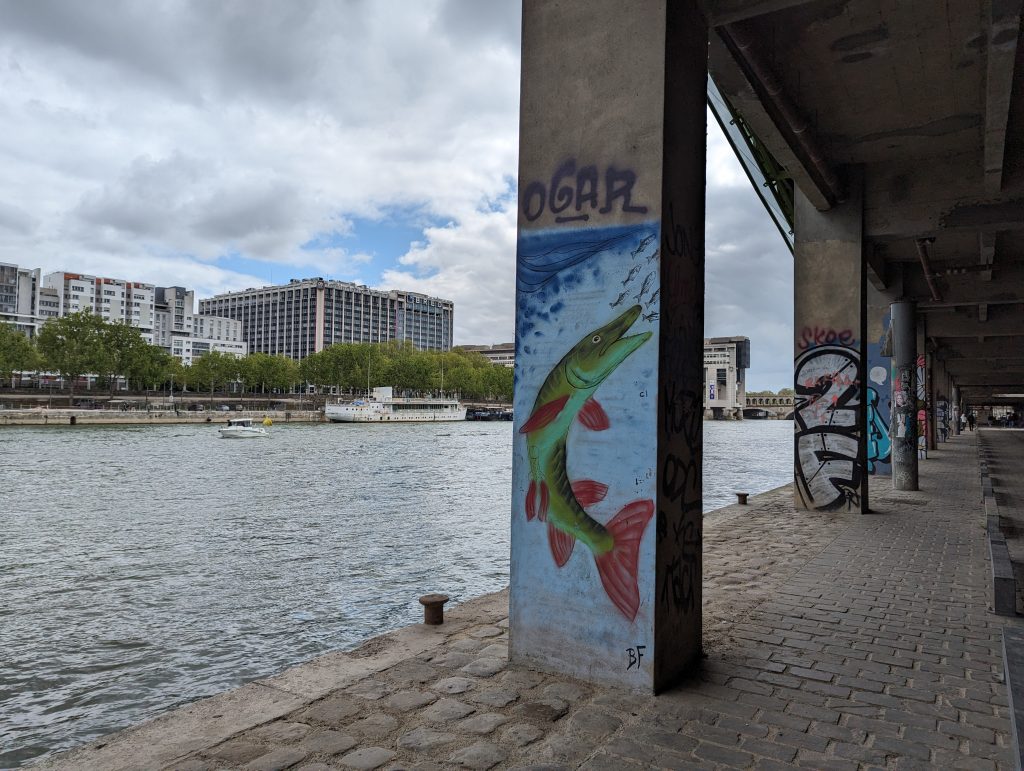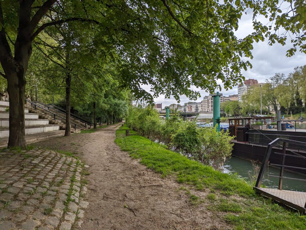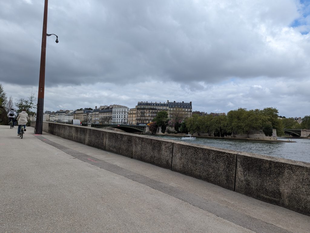 - We walk directly along the banks of the Seine, although we’re not entirely sure: Does the path continue? ‘Ah look’, I say pointing at a runner: ’He’s coming from that direction, he must be coming from somewhere.’ – So we walk straight into a dead end – where the runner has probably turned – great!