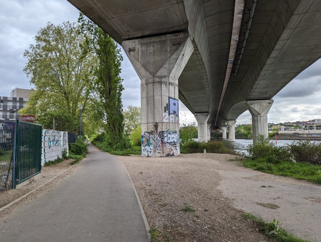 - We continue along beautiful little forest and field paths until we reach the point on the Seine where we cross the river over a large, busy bridge.