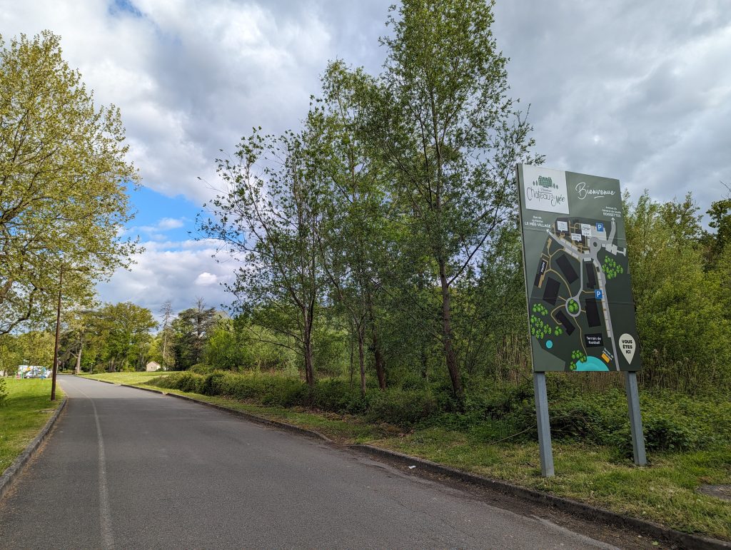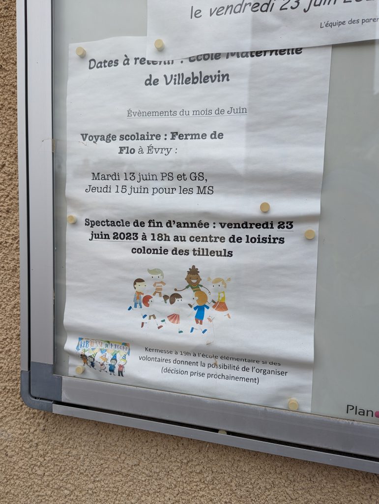 - We soon reach Villeblevin and pass the school, which is advertising a school trip to Ferme de Flo, where, funnily enough, we will be staying tomorrow. =)