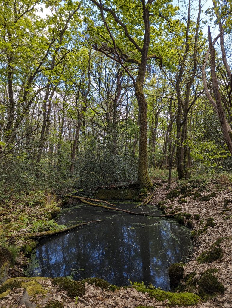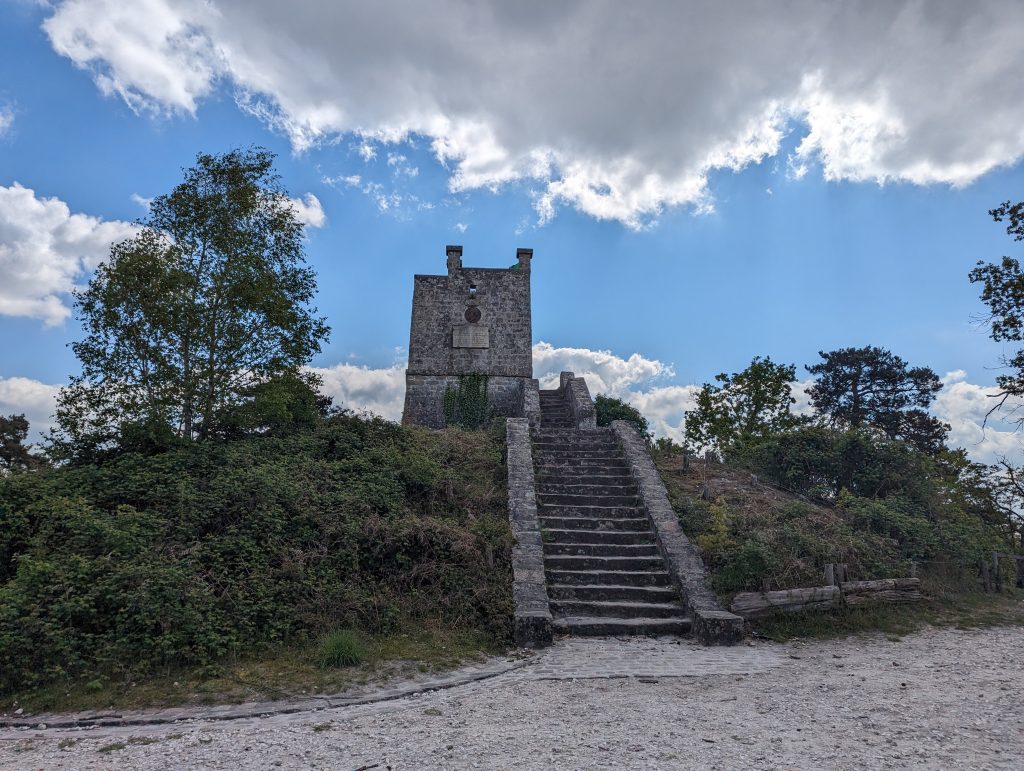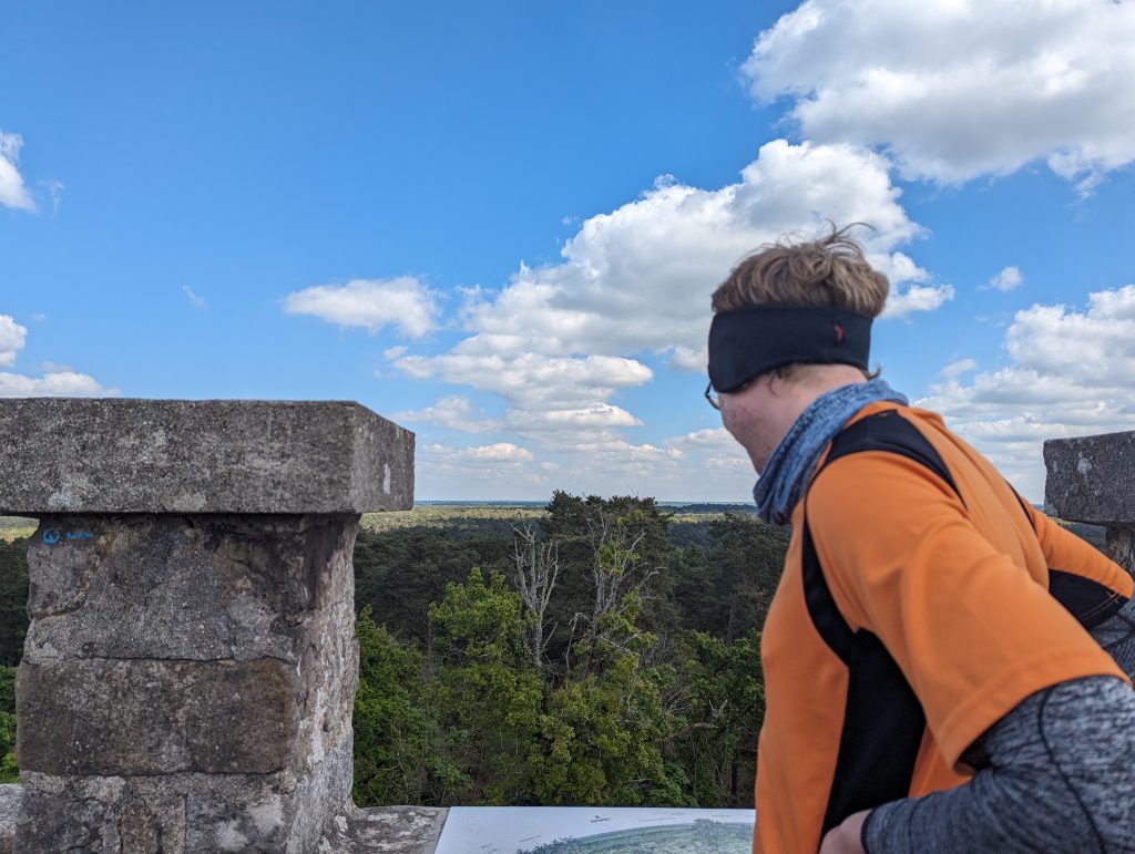- We reach a large clearing with a stone lookout tower, which is a bit old but looks sturdy and – to our own surprise – we manage to climb it and then enjoy the view over the forest – the treetops stretch out in front of us as far as the eye can see.