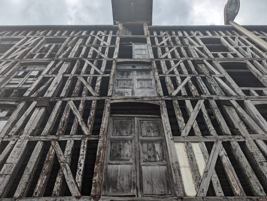 - We cross a bridge into the centre of the village, where we see a half-timbered house that is probably being renovated and of which only the wooden frame remains. Fascinating!