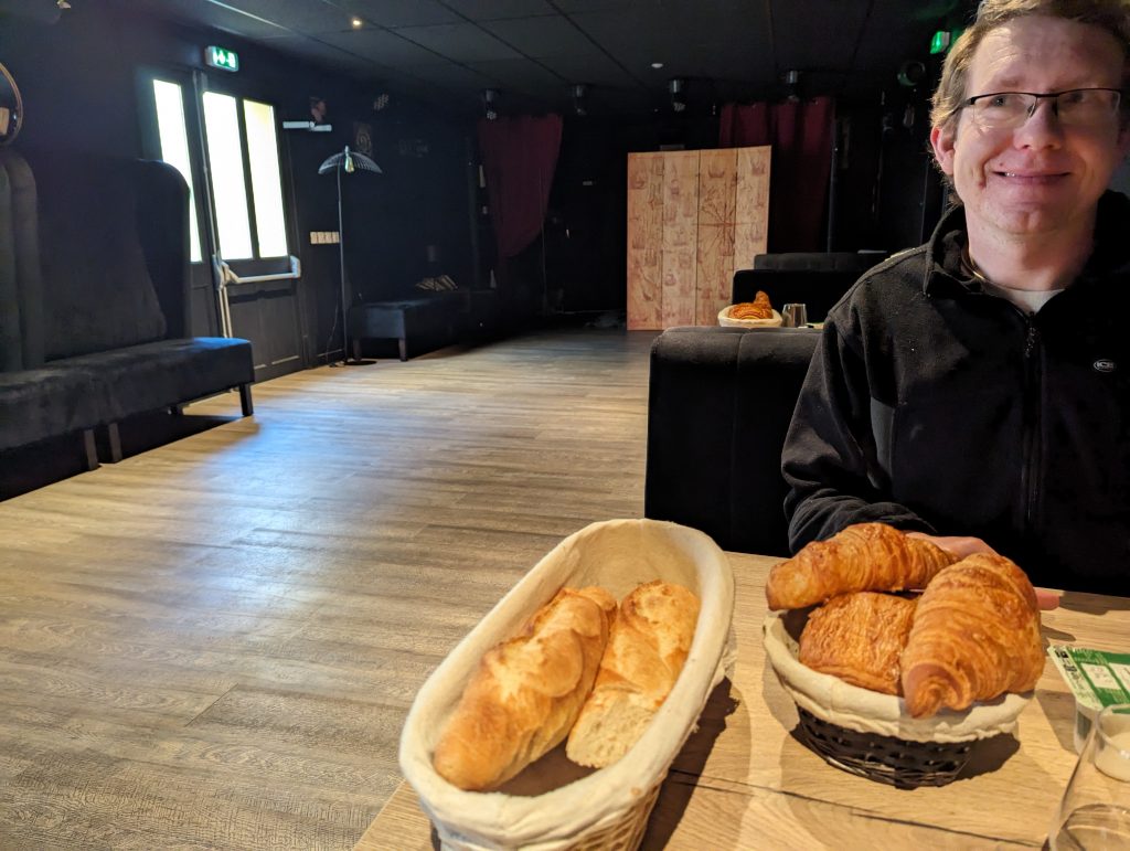 - Breakfast together with Pierre and Patrice, which we think is great, not only because they’re great people to talk to and always up for a laugh, but also because they don’t eat their pain au chocolats, which we can then take with us.