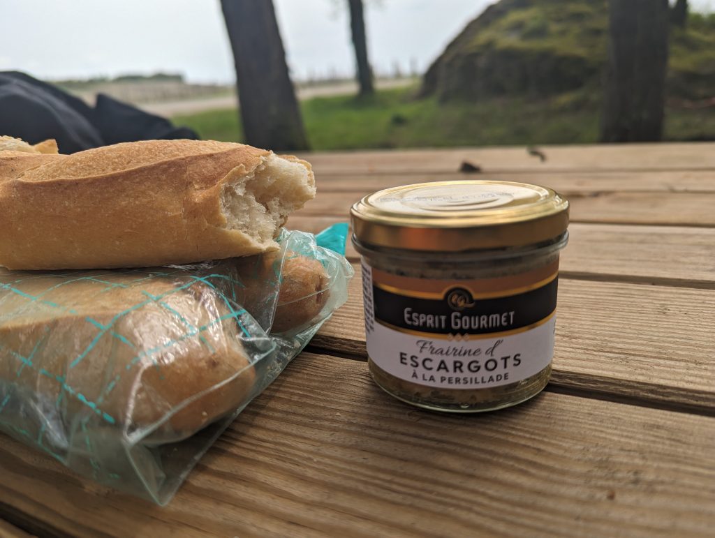 - We use the table for a break with a snack and try the snail pâté we picked up from the supermarket.