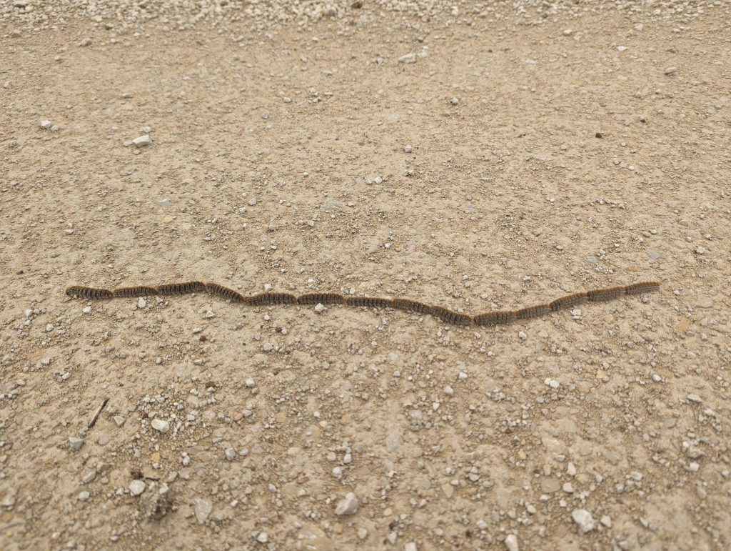 - We also observe a fascinating natural spectacle: lots of caterpillars have formed a chain so that they look like a long snake. They move synchronised along the path.