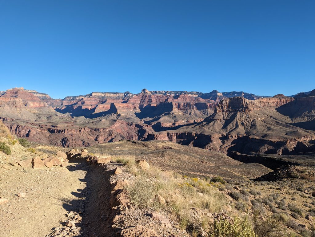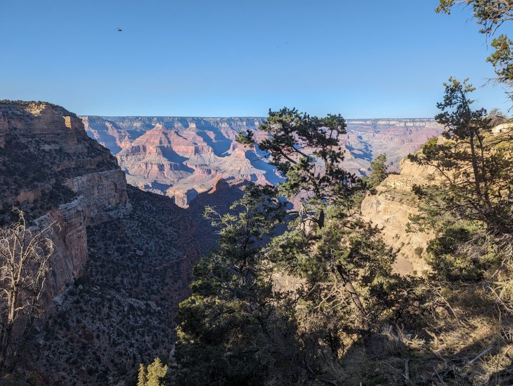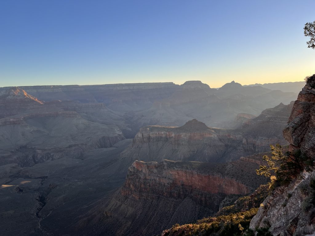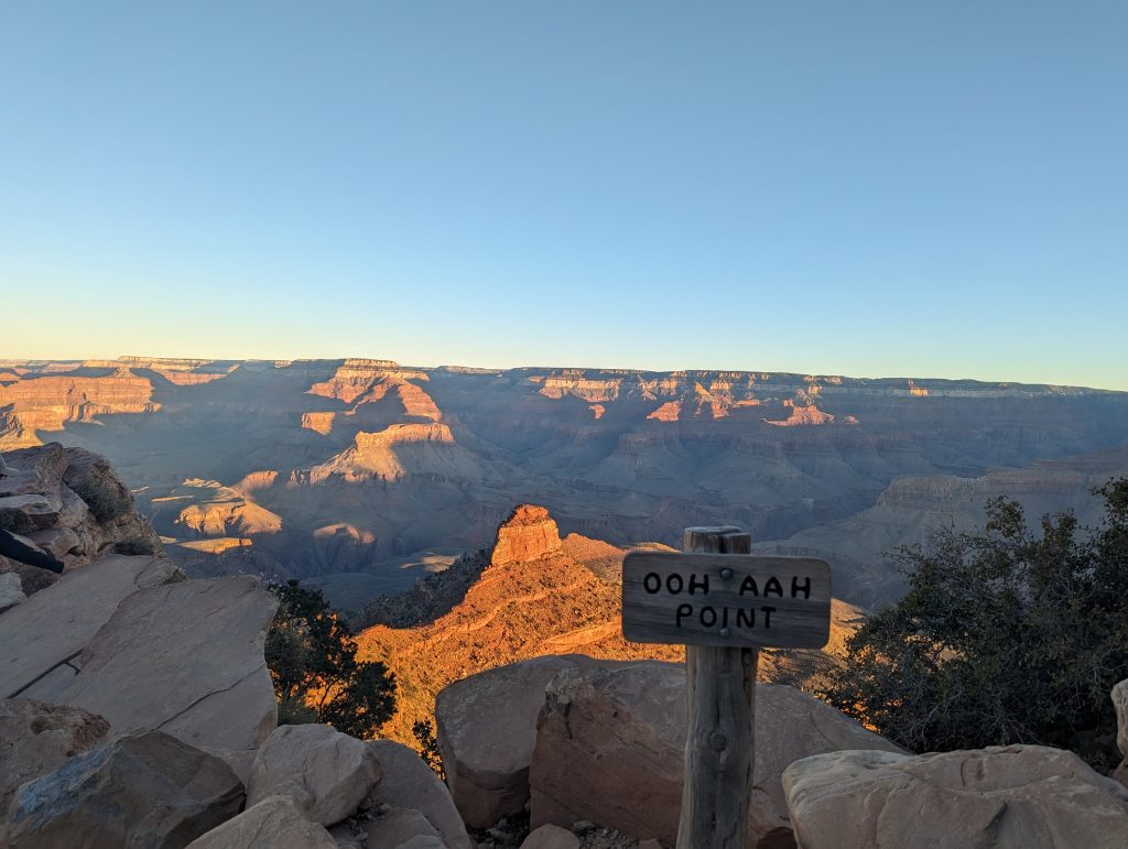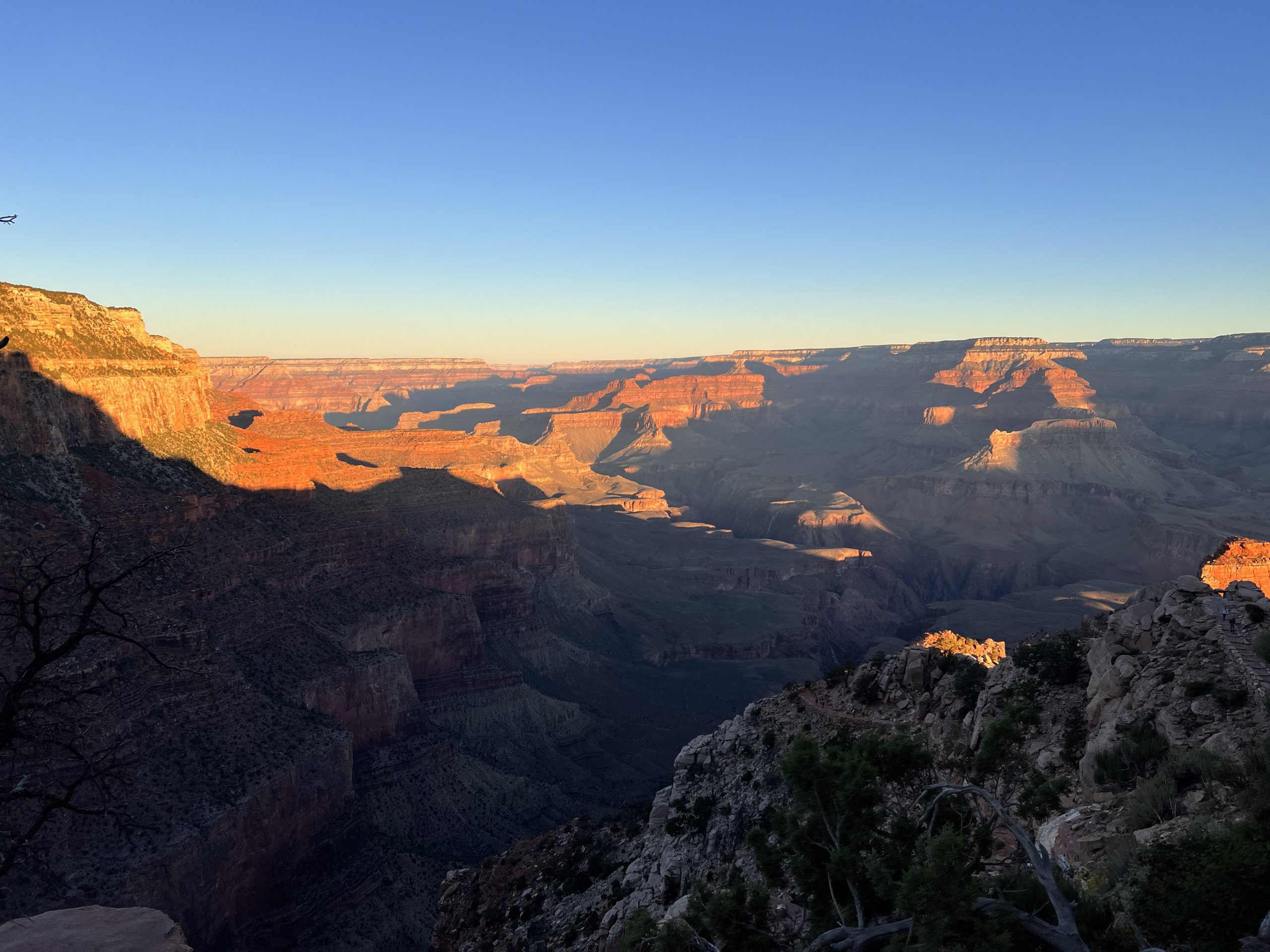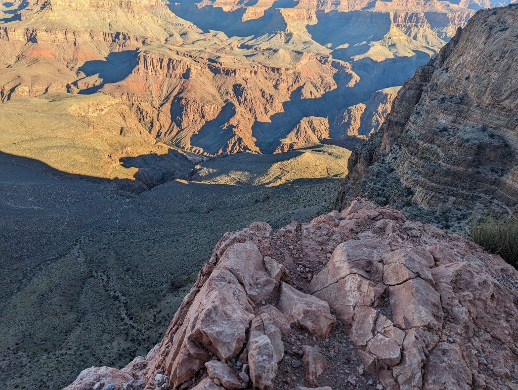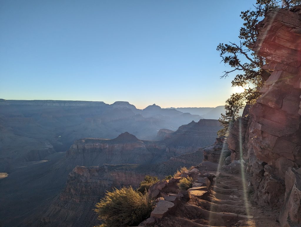 • The great thing about the South Kaibab Trail is that you have great views of the Grand Canyon and the play of light and shadow. More and more rocks are illuminated in a way that is really indescribably beautiful and always makes us stop in awe anew.