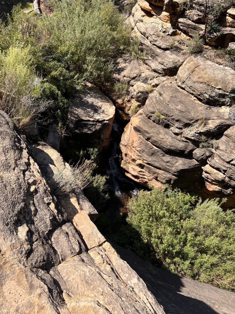 • The canyon first has steeply sloping rock faces, before some green areas (on which some kind of bushes and even trees grow) on plateaus give the impression of gently rolling green hills (it reminds me a bit of the Hobbits), between which, however, there are again smaller canyons that spread out like branches over the green areas, so that dark crevices open up that give the landscape a rugged but at the same time beautiful character.