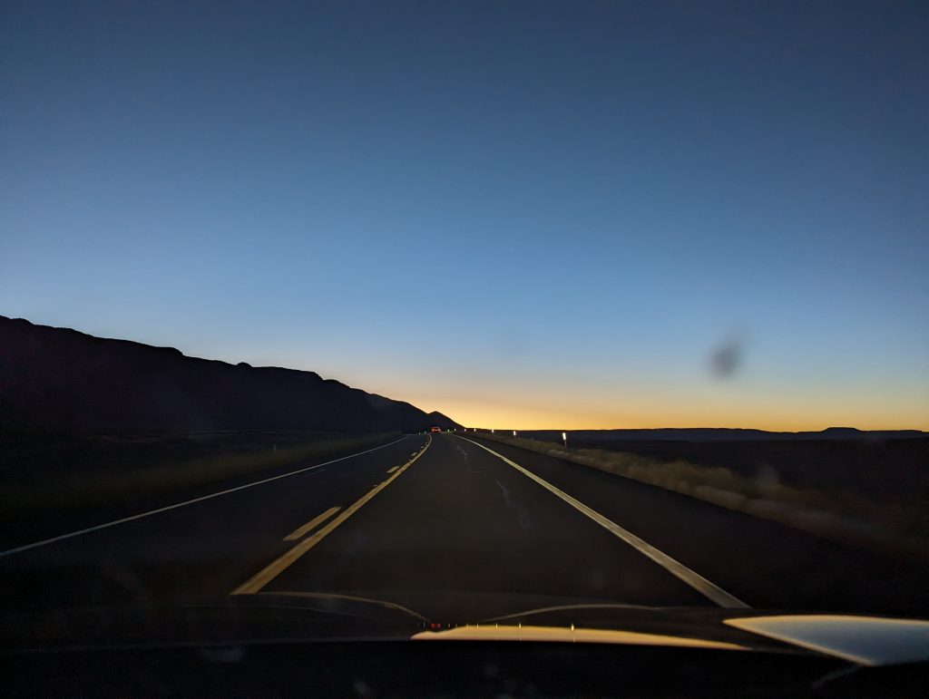• Our original plan to drive along the Grand Canyon at sunset of course goes wrong, because when we arrive it is pitch dark and we see nothing but dark forest on the left and an unfathomable pitch at the right of the road