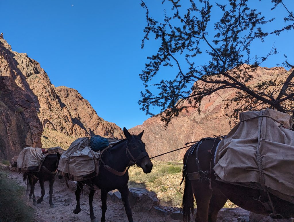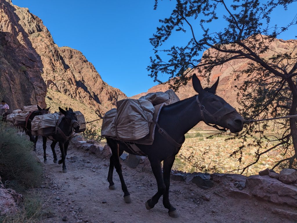 • Later, a second group of mules passes us, carrying people down – this is of course the more relaxed way to see the canyon from below.