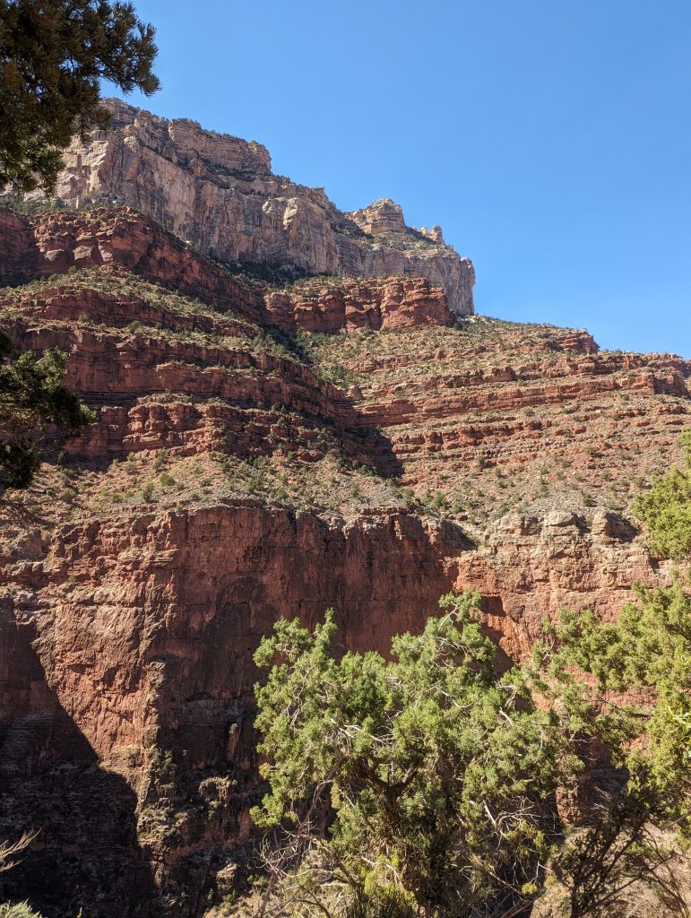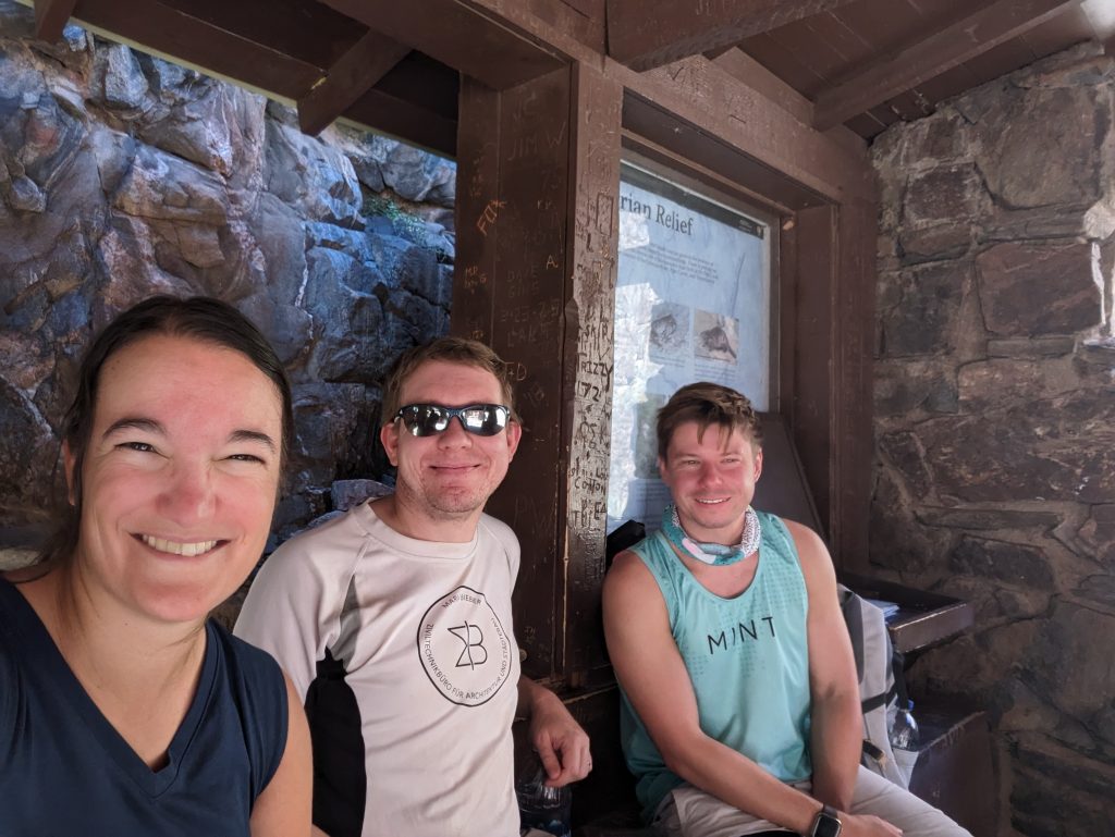 • We start talking to other American hikers and realise that hiking the Rim Trails (South Rim and North Rim Trails) is a lifelong goal of some people – a hiker from Arizona tells us that he trained for 6 months for this and is hiking from the North Rim to the South Rim today together with friends and his sons – they left at 4:15 with headlamps – amazing!