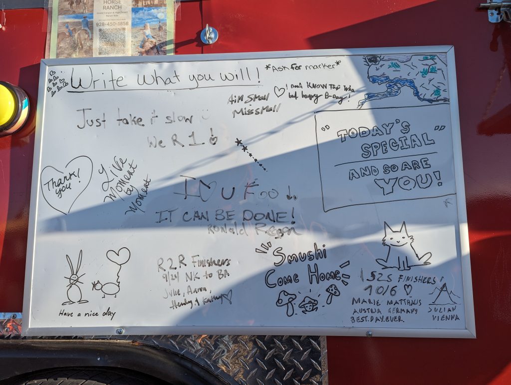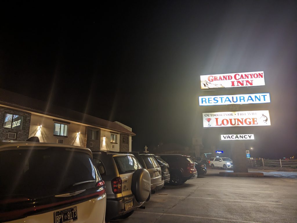 • Good for us that the Grand Canyon is so touristy and that there is a place right at the park entrance with a supermarket that is still open at this time of day – this is where we stock up on supplies for the planned hike tomorrow.