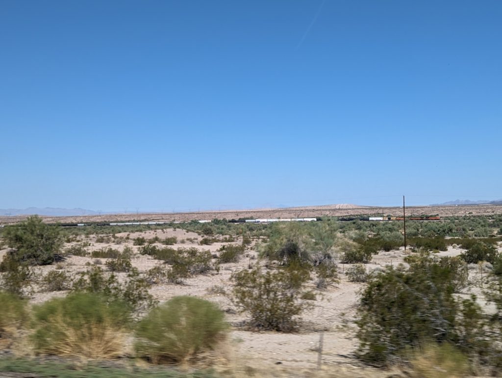 • To the right of the interstate runs a railway line on which we see one goods train after the other pass by, which are so long that even on the straight surface where you can see the horizon, you can hardly see the end when the locomotive passes you, a madness!