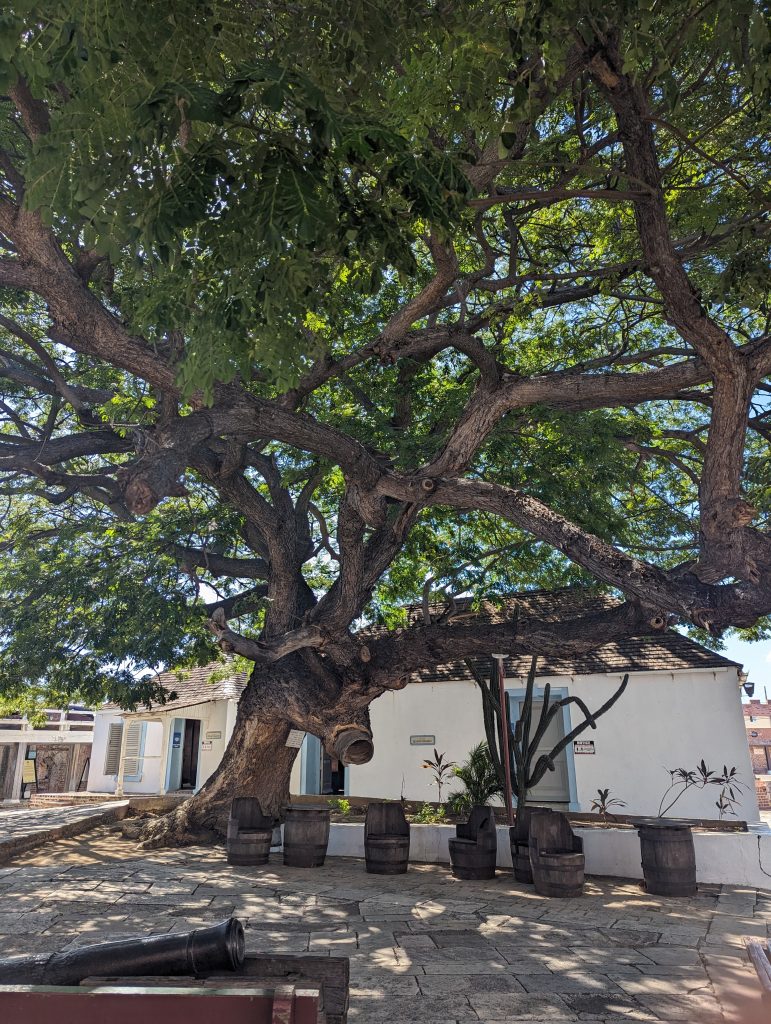 • Thank goodness there’s a large tree under whose dense canopy you can find shade in the open courtyard – which is necessary with the sun burning down.