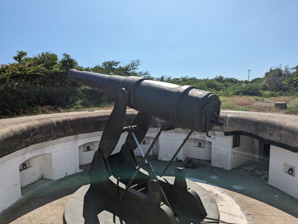 • Finally, we take a look at the replica of a large cannon, which was so special because it could be lowered into the ground using a mechanism.