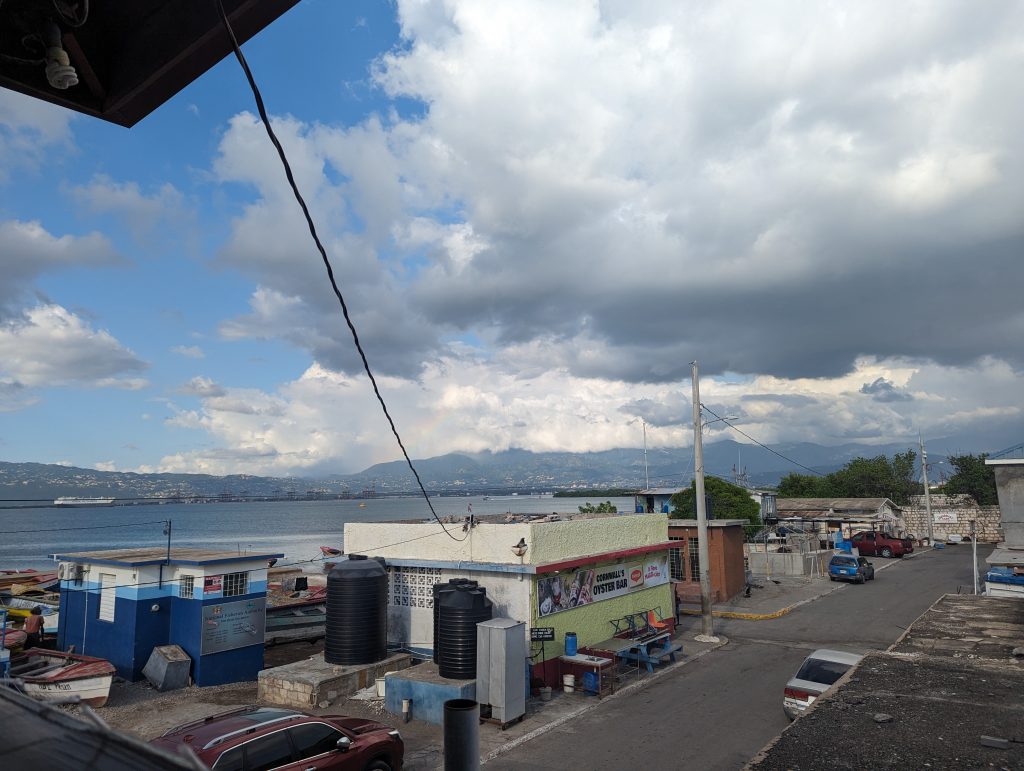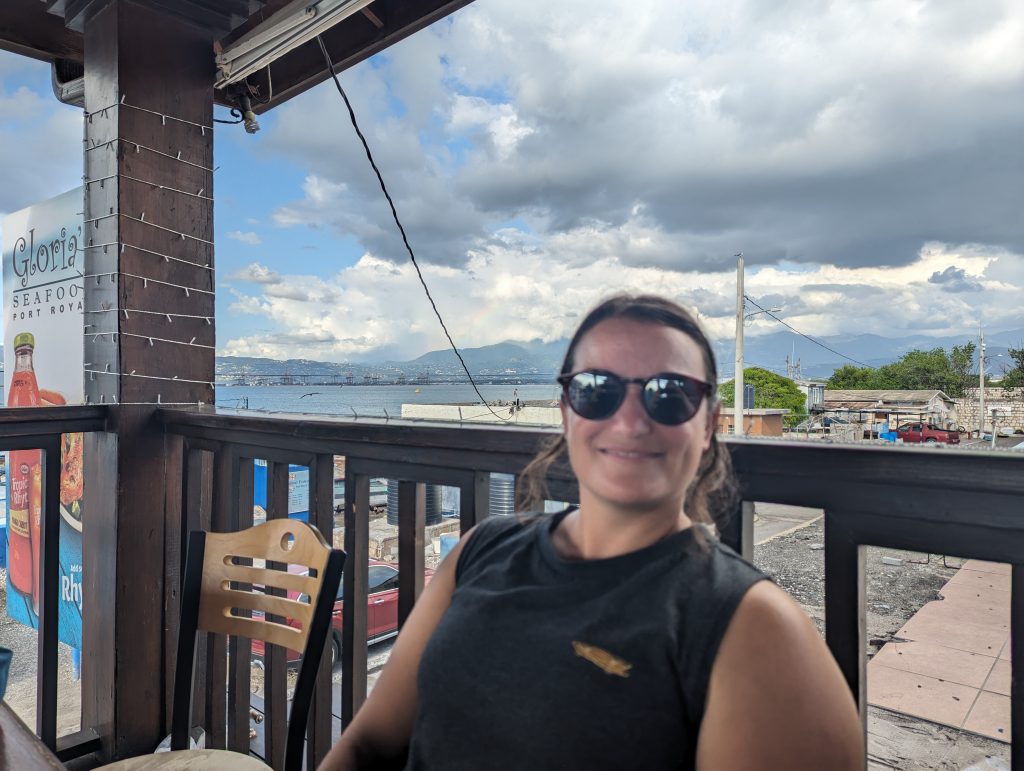 • It doesn’t matter, because we have time and you sit outside on the roof terrace, which overlooks the harbor of Kingston and a bit of the sea, which makes the wait only half as bad.