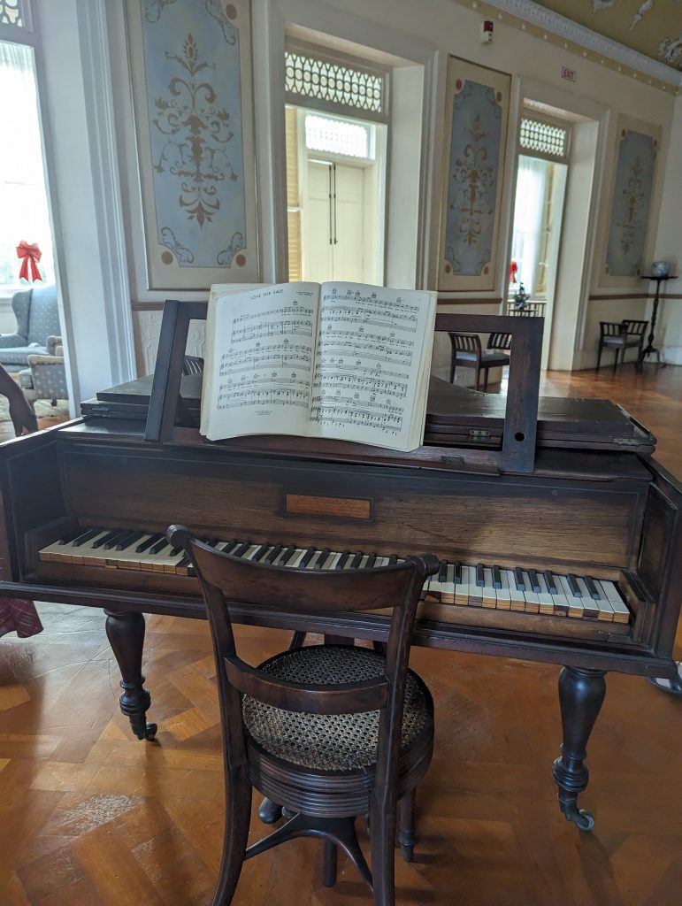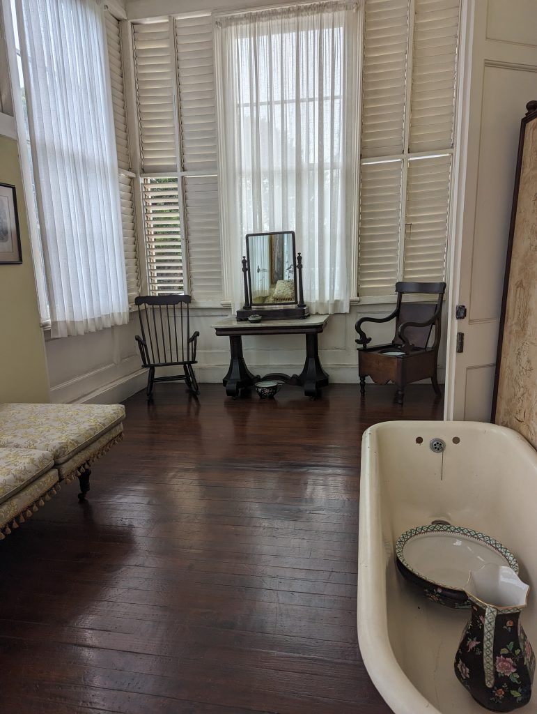 • We also see the patio, with a checkerboard tiled floor that looks out beautifully over the garden, the master bedroom, a ladies’ tea room, several bathrooms and a few other rooms, most of which are still originally furnished.