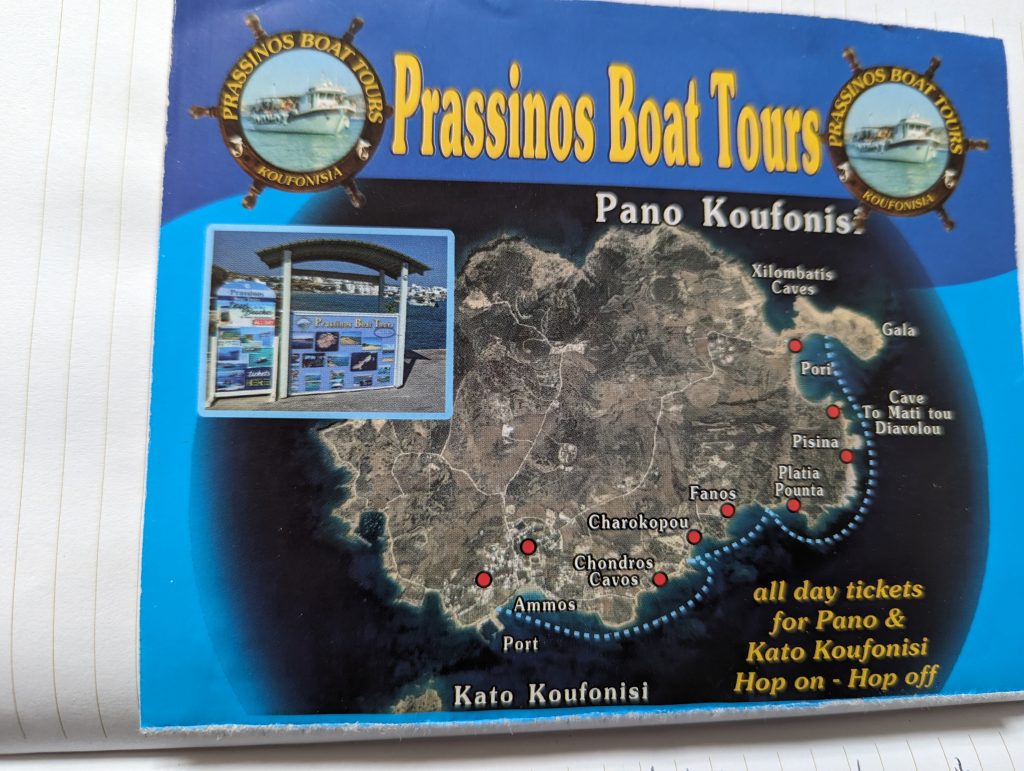 - To ferry terminal in Katapola, find post box, post postcards, ferry to Koufounisi, 30 minutes fast boat (I wouldn’t have needed to bring lunch for 10 people), Katamaran, huge one