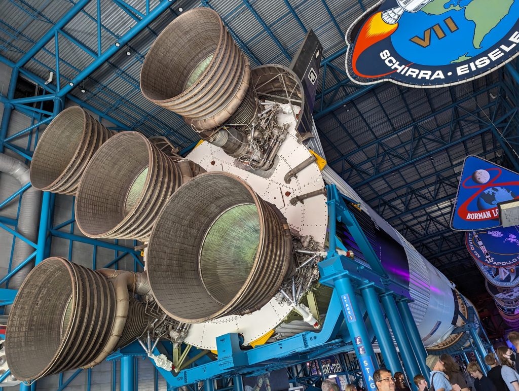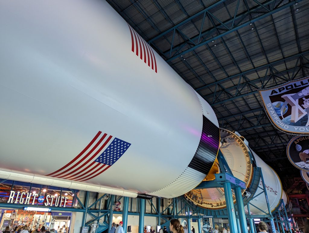 - As soon as you enter the large exhibition room that follows, you are overwhelmed by the sight of the full-size replica of the Saturn V rocket lying on its side – these are dimensions.