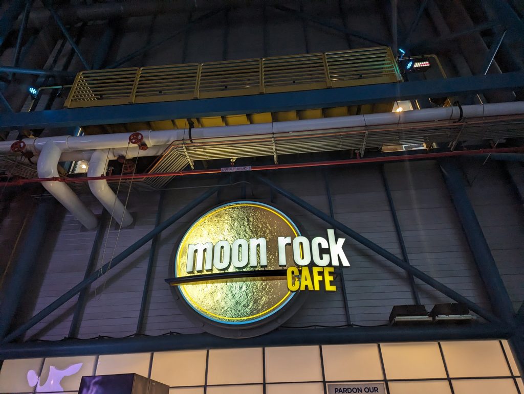 - We take our lunch break here in the café and eat a hot dog and salad with a view of the Launch Pads – not bad.