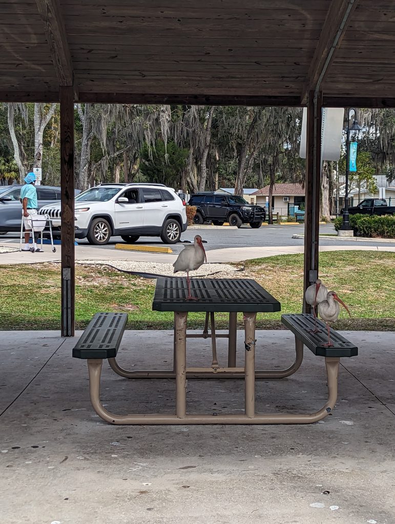 - We sit down on one of the tables that hasn’t been taken over by ibises and eat snacks.