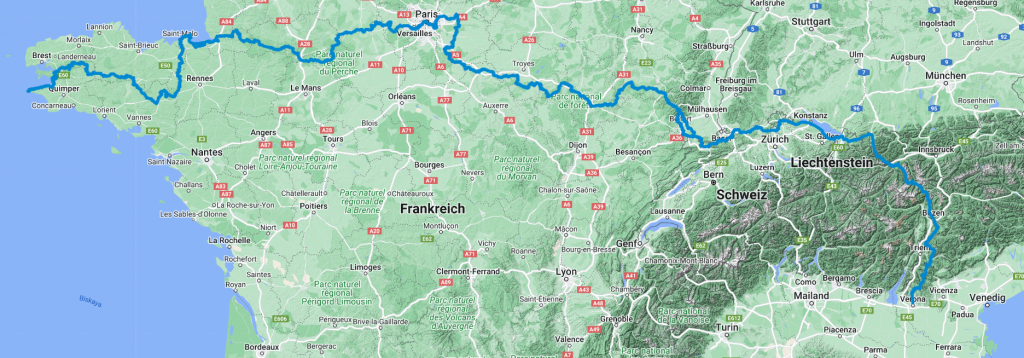 When we decided to hike the E5 European long-distance hiking trail a few weeks ago, the reaction we mostly got from friends was: “Oh, that’s super cool and where does it go?” But some die-hard hiking fans were familiar with it and then the reaction was: “Ah, it goes from Oberstdorf to Merano, doesn’t it?” Part of the E5 does indeed run from Oberstdorf to Merano over the Alps, but that is only part of it. The entire E5 starts at Pointe du Raz in France and then runs through France via Mont Saint Michel and Paris to the Swiss border, entering Switzerland via Basel. The route then continues along the Rhine to Lake Constance, from where it reaches the Allgäu region via Bregenz and cover almost 50 kilometres in Germany via Sonthofen and Oberstdorf to the Alps. The route then crosses the Alps via the Braunschweiger Hütte, Zams and a section of the Pitztal valley through Austria and finally reaches Italy via the South Tyrolean Alps, Merano and Bolzano, where the E5 ends in Verona.