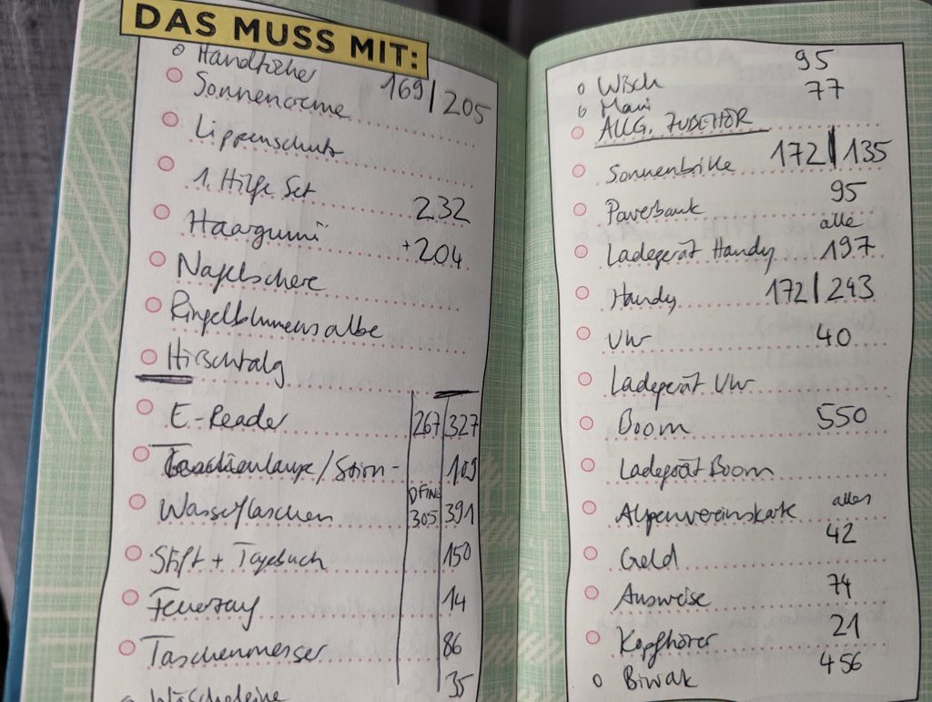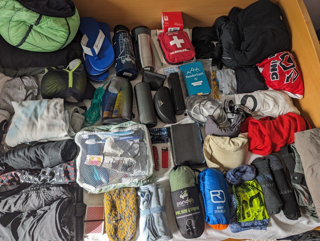 Of course, ‘less is more’ when hiking – especially when you’re travelling on foot for several weeks at a time. That’s why we only packed two sets of hiking clothes and one set of dry clothes for the evenings and otherwise only things that you need when hiking such as a pocket knife, head torch (we’ve actually already used it – I’m not proud to say…) and blister plasters. You can find a more detailed list below if you’re interested. Basically, we tried to limit our weight per rucksack to 6kg and (almost) succeeded!