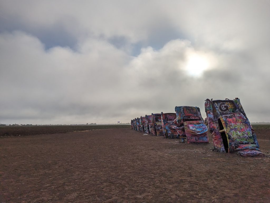 - The first stop is the Cadillac Ranch, which was built in 1978 by a rich guy and consists of a row of Cadillacs buried nose first in concrete – funnily enough, I check the 1947 guide to see if they existed back then (of course they didn’t); later I find out that the Cadillacs that are buried date from 1948-1956.