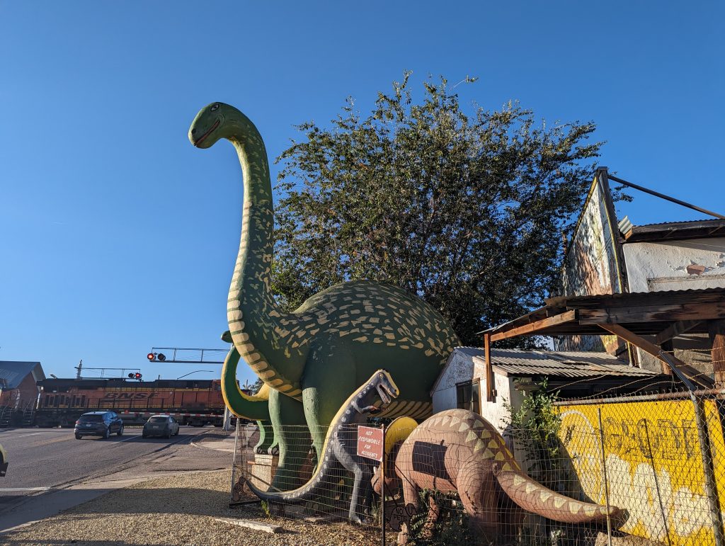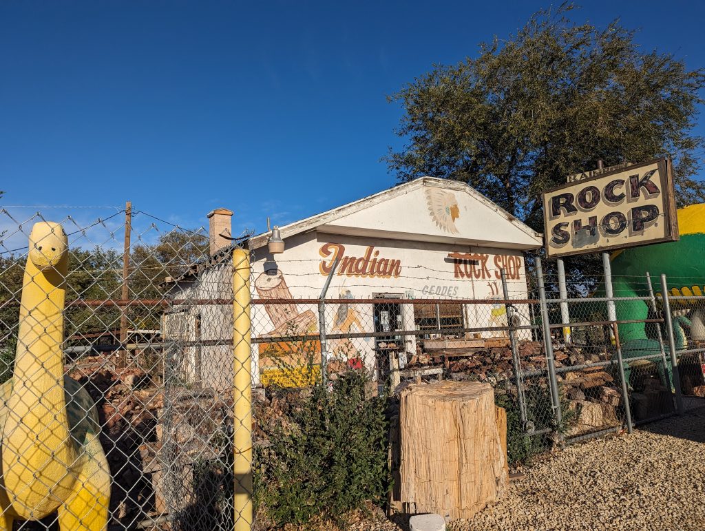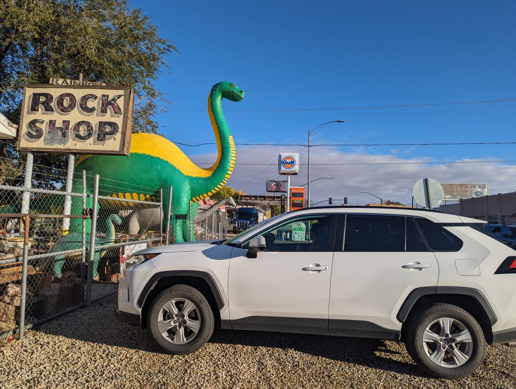- We set off through the Route 66-obsessed town of Holbrook, where there are dinosaur statues on every corner, especially in front of a store, the Rock Shop, which has put them up to make the store more attractive- it works well considering that we drive past because we want to see the dinosaurs (the store is closed though).