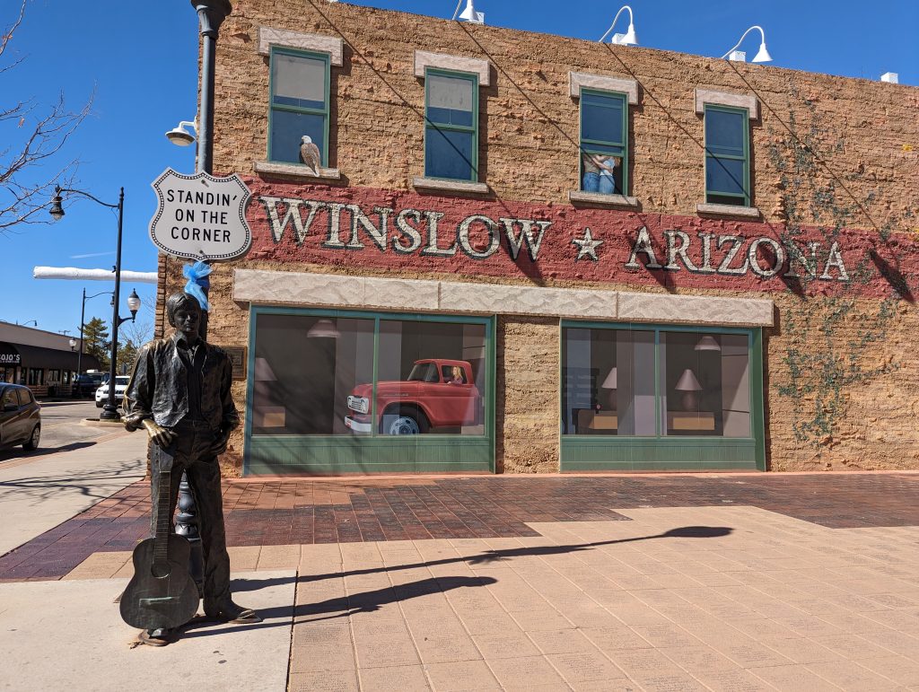 - Thanks to the hit “Take it easy” by the Eagles in 1972 and the line “I’m a standing on a corner in Winslow, Arizona”, Winslow may not exactly be world-famous, but it is “USA”-famous, so to speak, and attracts a number of American tourists who enthusiastically take photos with the “Standing at the Corner” statue.