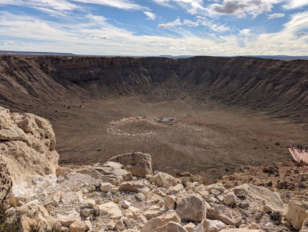 - We continue on to the equally famous Meteor Crater, a huge crater into which a meteorite has crashed.