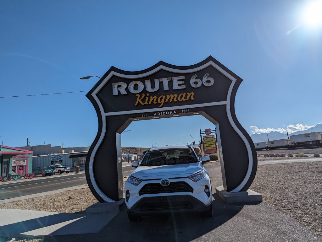 - Next stop is Kingman, where there is an old Santa Fe Railroad steam locomotive and a large visitor center. We take a quick look inside and send another postcard (remember we send postcards to our families from the entire route?).