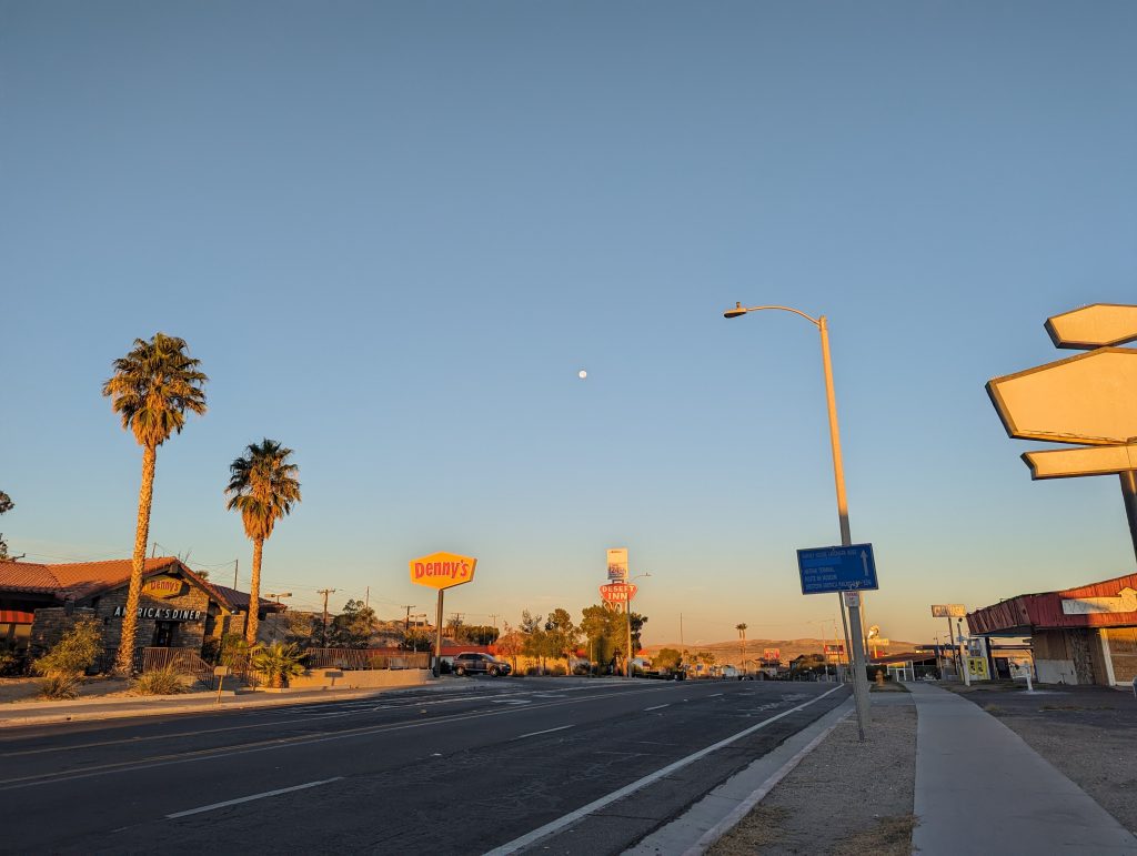 - The road still leads through the Mojave Desert and there is nothing but sand and small desert shrubs far and wide – it is beautiful in the morning light, but at the same time very lonely.