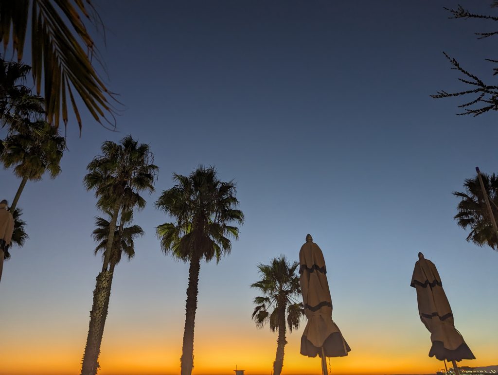 - There we get a great seat with a view of the palm trees, beach and sea and the setting sun. We order – stupidly, because we still have some food left – calamari and octopus.