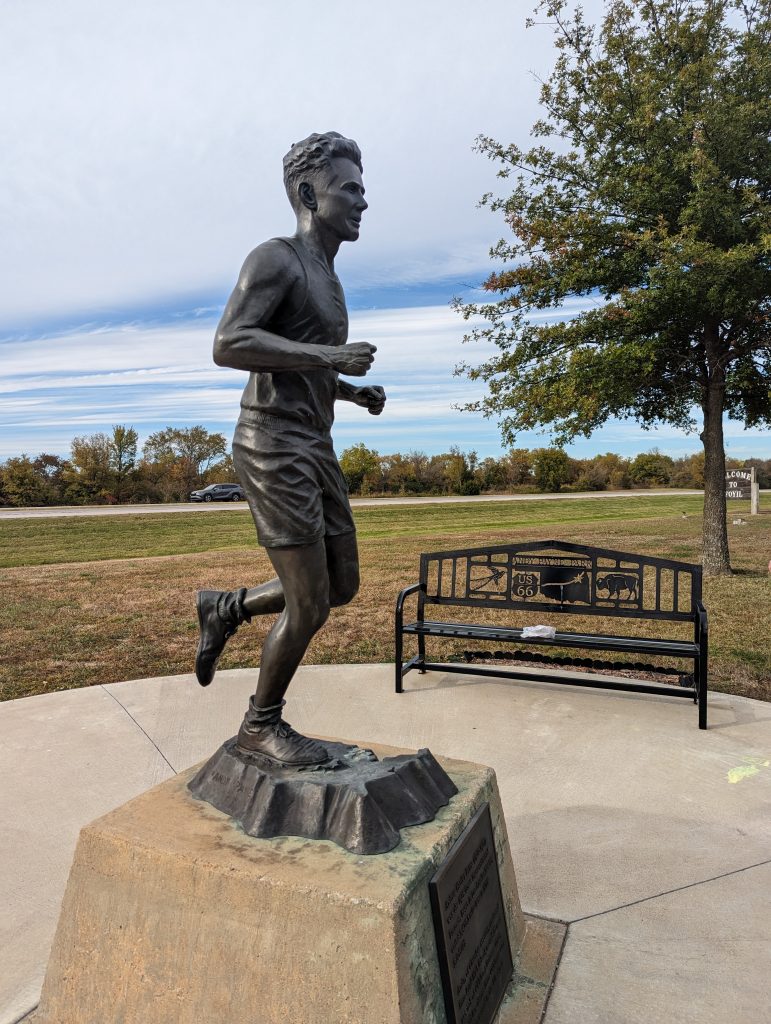 Amongst others, a road was planned to connect Chicago to Los Angeles in 1926, which was given the number 66. Even though many of the road sectors already existed, it took until 1937 for the entire road to be paved. Right from the start, a publicist was employed to promote Route 66. One of the initial events was an ultra-marathon of around 5500km, most of it over Route 66, which to everyone’s surprise was won by the then unknown Andy Payne, a member of the Cherokee Nation. In his honor, a statue of him still stands today in Oklahoma, his home state, next to Route 66.