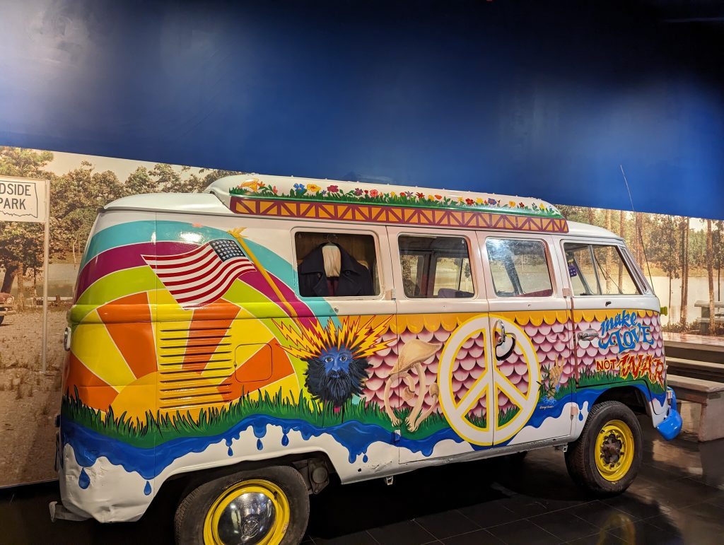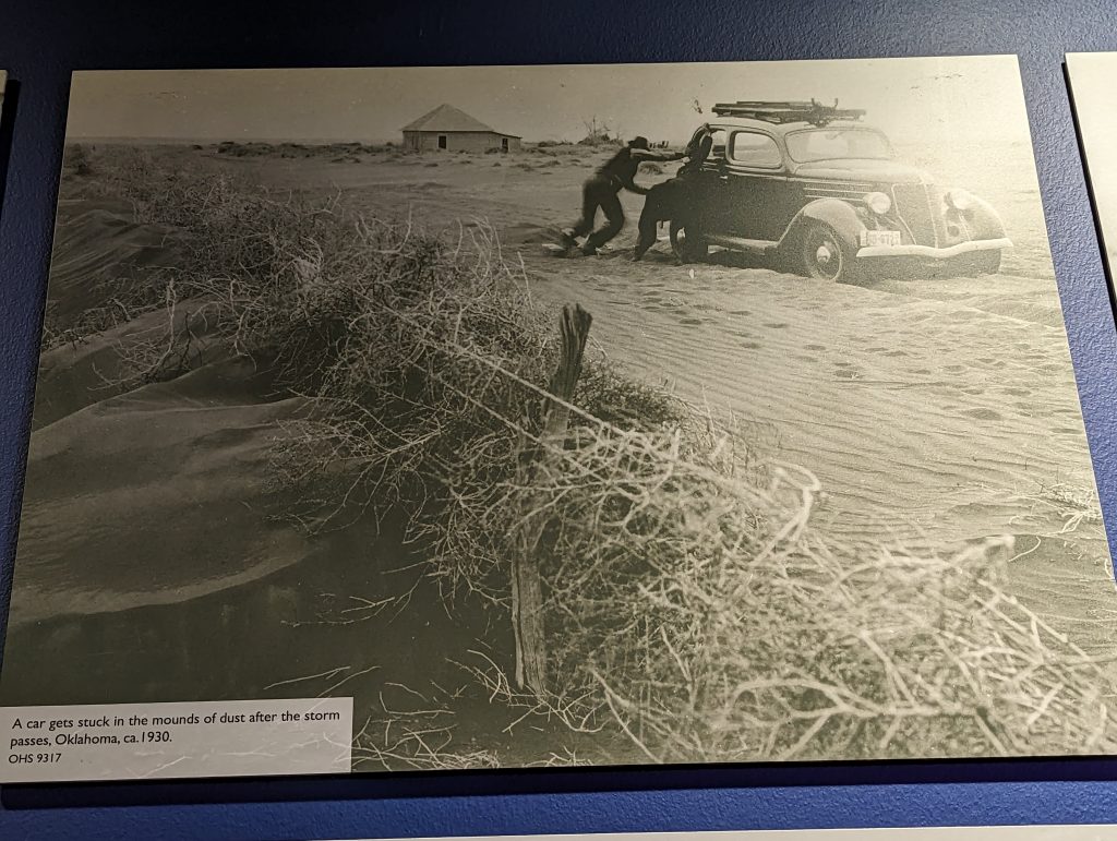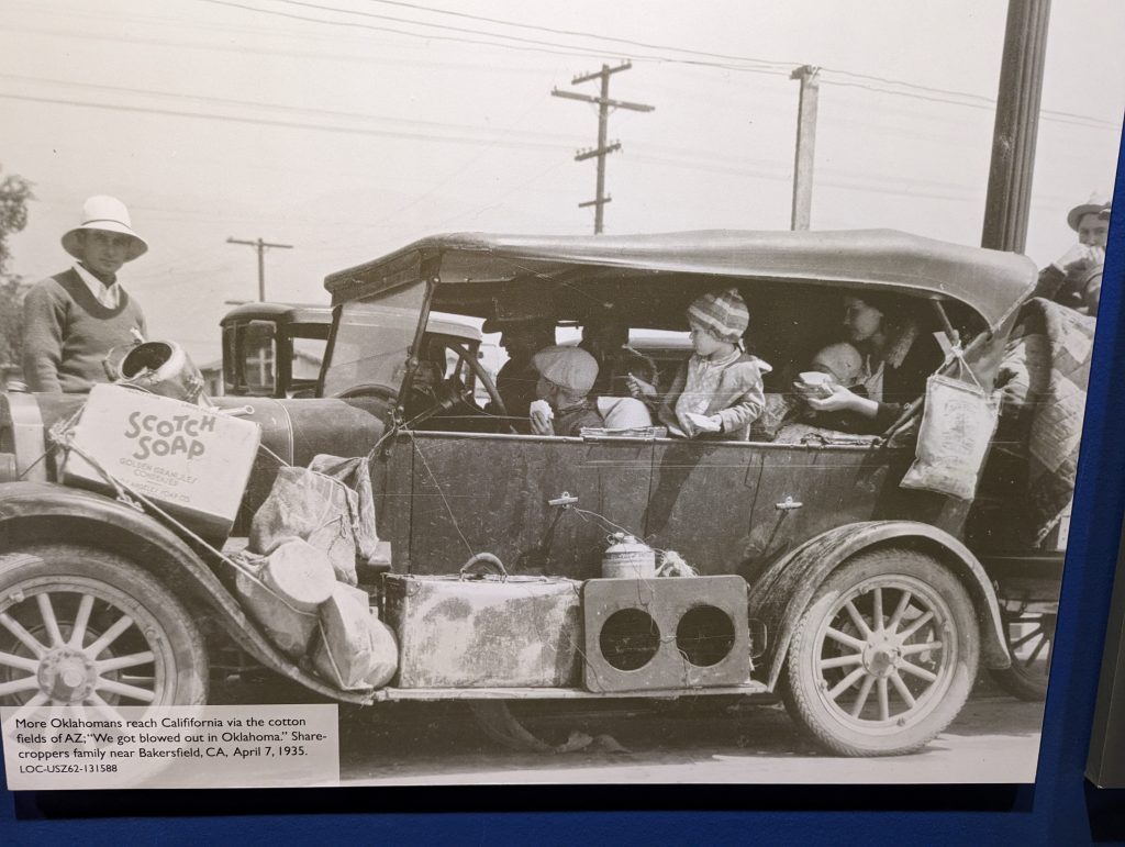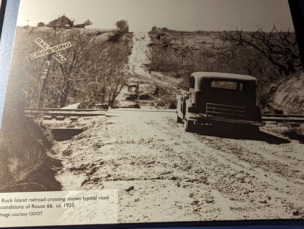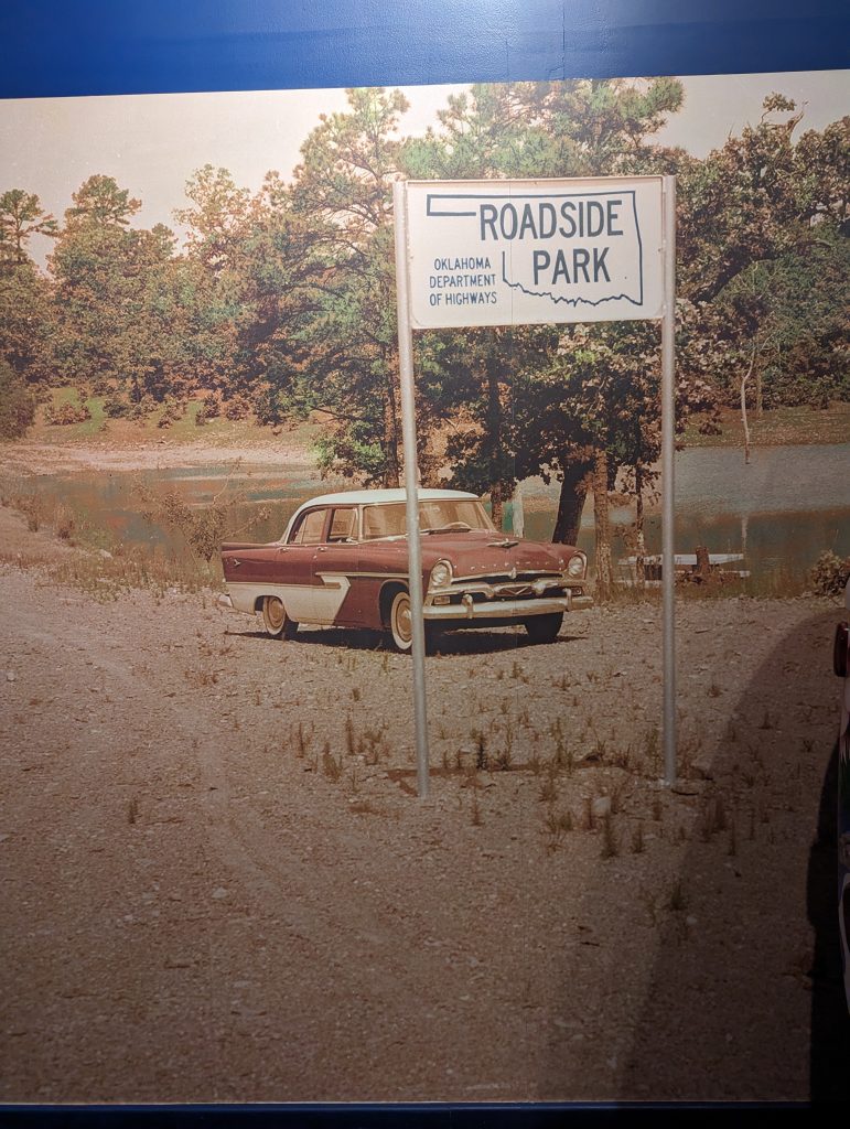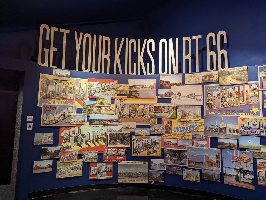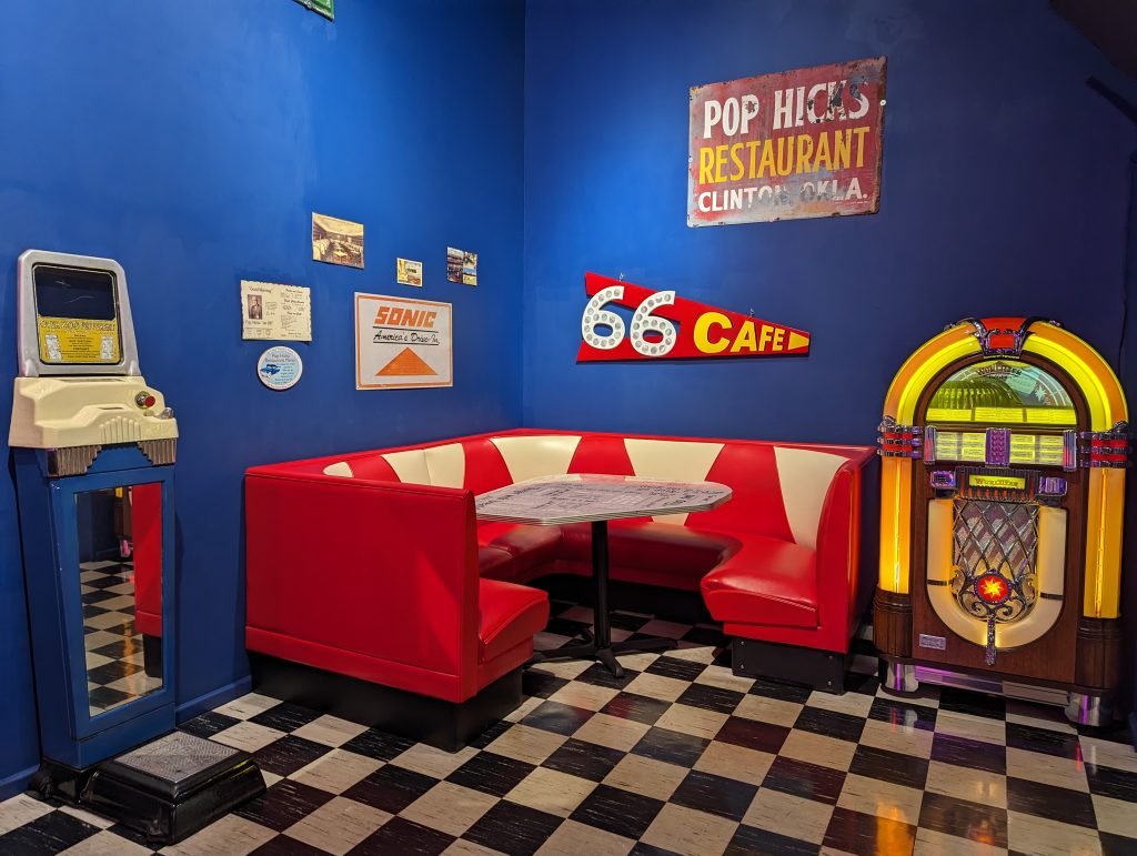 The route experienced a revival in the 1940s, first during the Second World War, when it was expanded for mobilization purposes, and then after the war, when it was used by families as a kind of excursion destination. Similar to today driving along it was seen as a romanticized road trip. We also buy a guide (originally from that period) in the museum store, which describes the attractions along the route from that time. Back then, there were cafés, petrol stations (the petrol stations were much smaller) and motels in almost every town along Route 66 – a real boom for the route and the towns it passed through. The Dust Bowl era of the route was replaced by an image of freedom and “Get your kicks on Route 66”, as Nat King Cole sings.