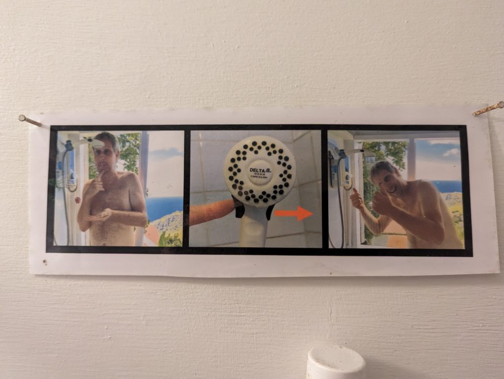 - Speaking of showers: using them is more difficult than you might think, so here are some picture instructions – with our host posing as the model: