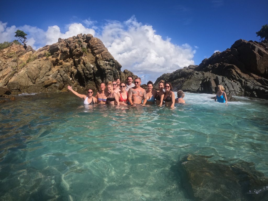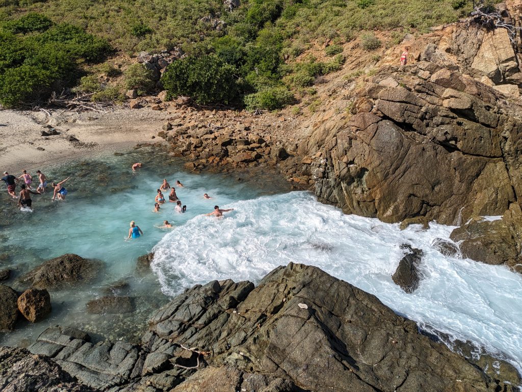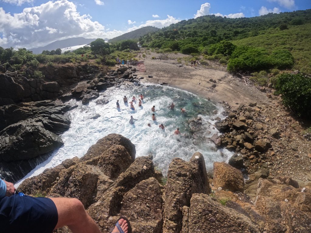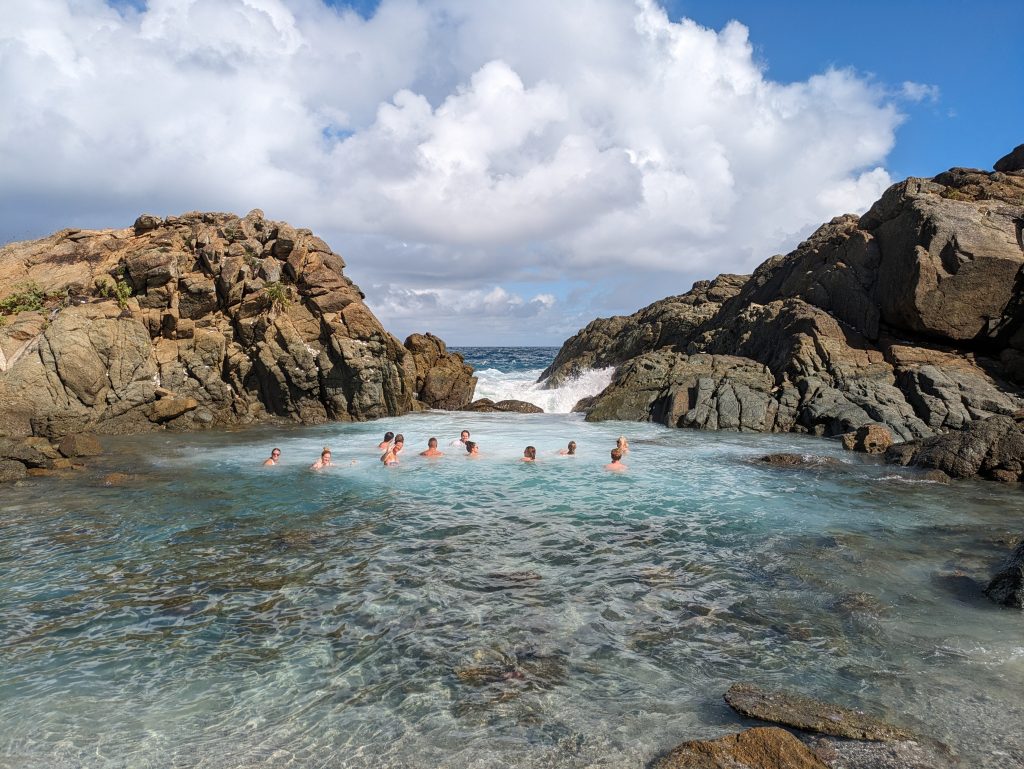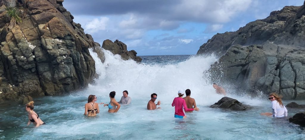 - You can walk from the shore to this naturally formed pool, in which the waves break in such a way that it is like a whirlpool, which we do – together with the others.