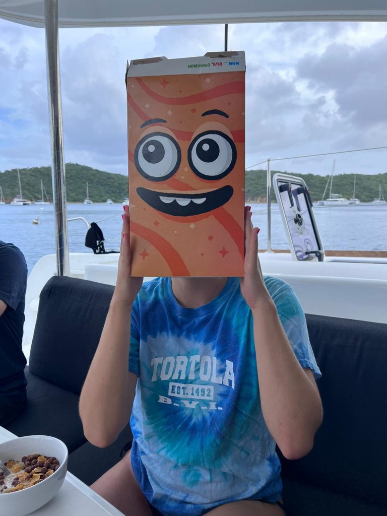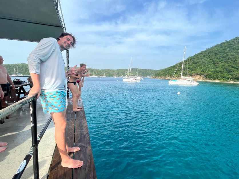 - As soon as we have moored at a buoy before lunch, a guy with a dinghy approaches us, who we think is the harbour master coming to collect money. It turns out to be not the harbour master but Sam, a random guy who greets us loudly with a song – a memorable experience.