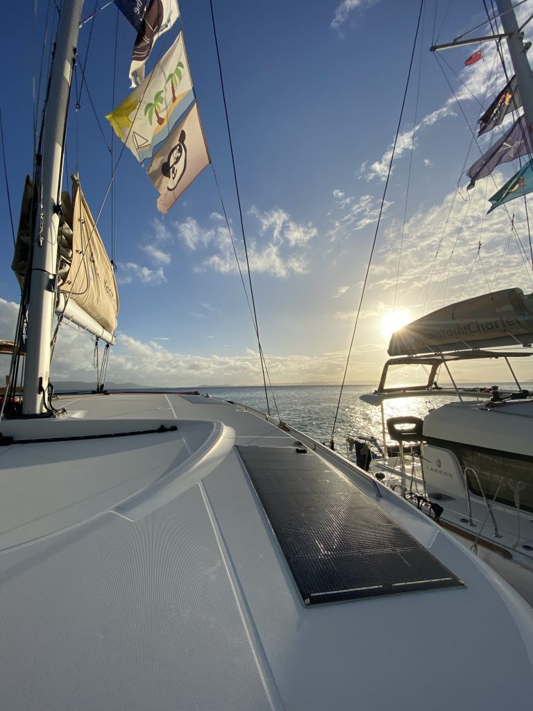 - Then the guy at the steering wheel and her try to moor at the buoy together: After the guy has run over the buoy about 5 times, his wife/friend finally catches it with the boat hook, whereupon the guy runs over the buoy and the boat hook without batting an eyelid. Unsurprisingly, the boat hook cannot withstand such forces (a catamaran running it over) and breaks off. After our skippers saw this, they insist even more than ever on picking up buoys at the stern instead of the bow and, if at the bow, then to the side of the catamaran and not in the middle. So there they are, without a boat hook and buoy, looking slightly desperate. Sam finally takes pity on them (after watching the scene slightly amused for a while) and comes to them with his little dinghy, picks up the buoy and the ruined boat hook and hands both to the woman. To top it all off, she lays the line so that it runs over the railing, which is almost torn down as a result.