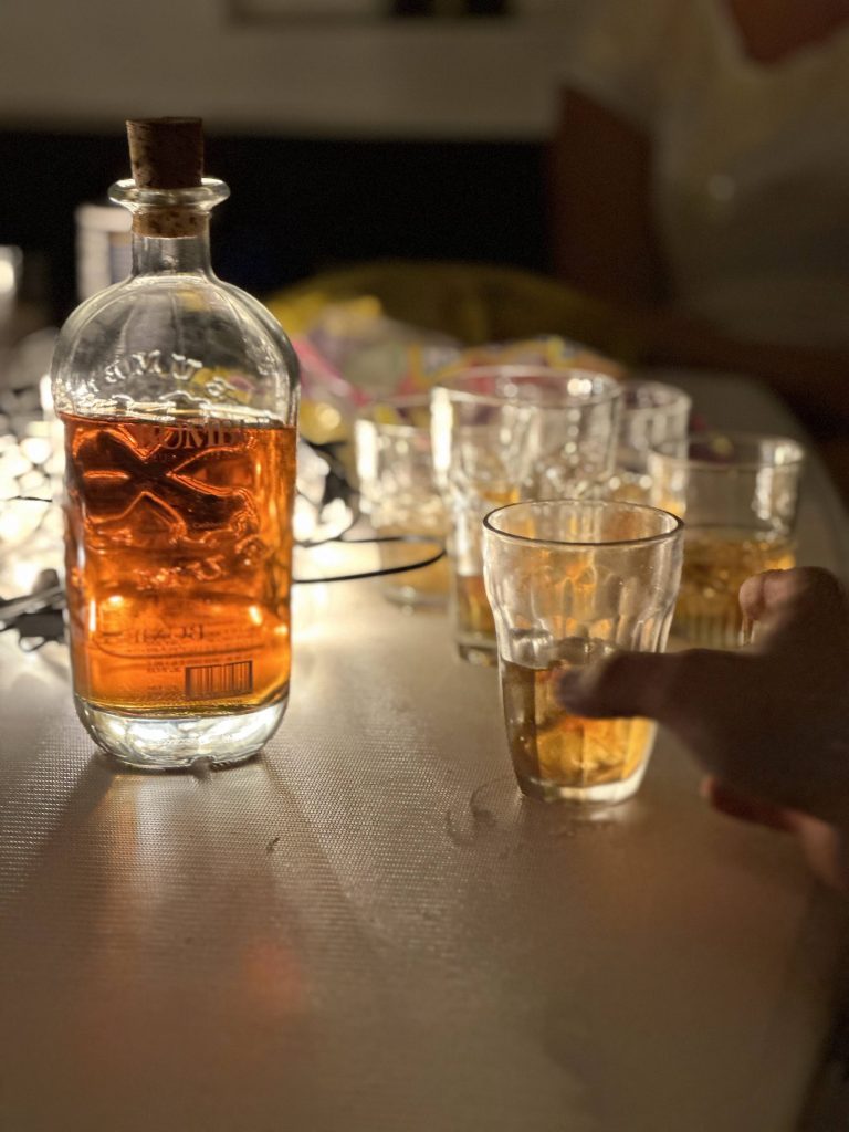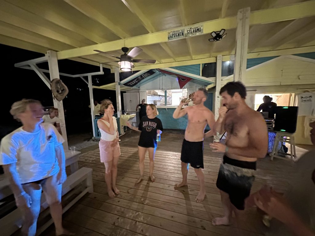 - Nate and Brent swim over with the crate of leftover alcohol and we distract ourselves by dancing, singing, drinking and chatting.