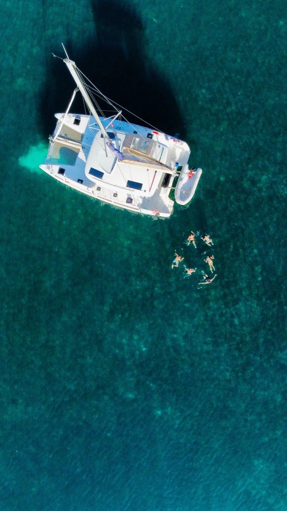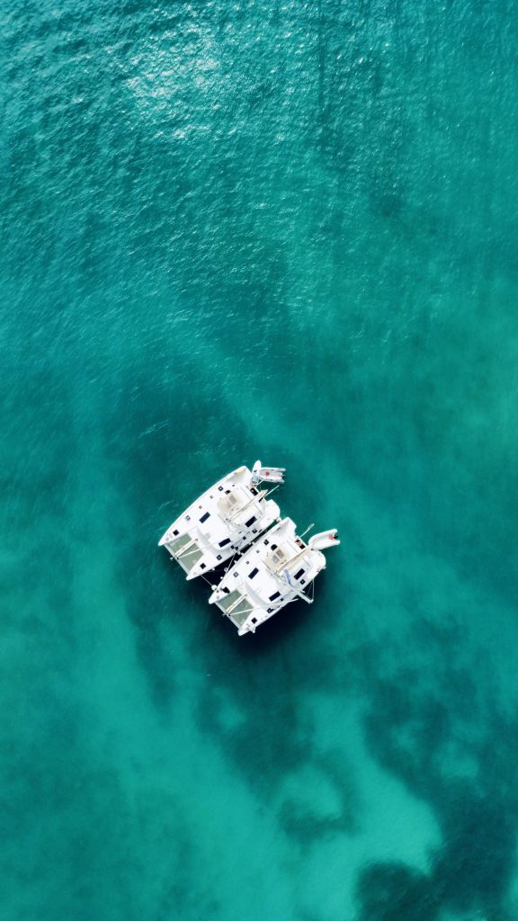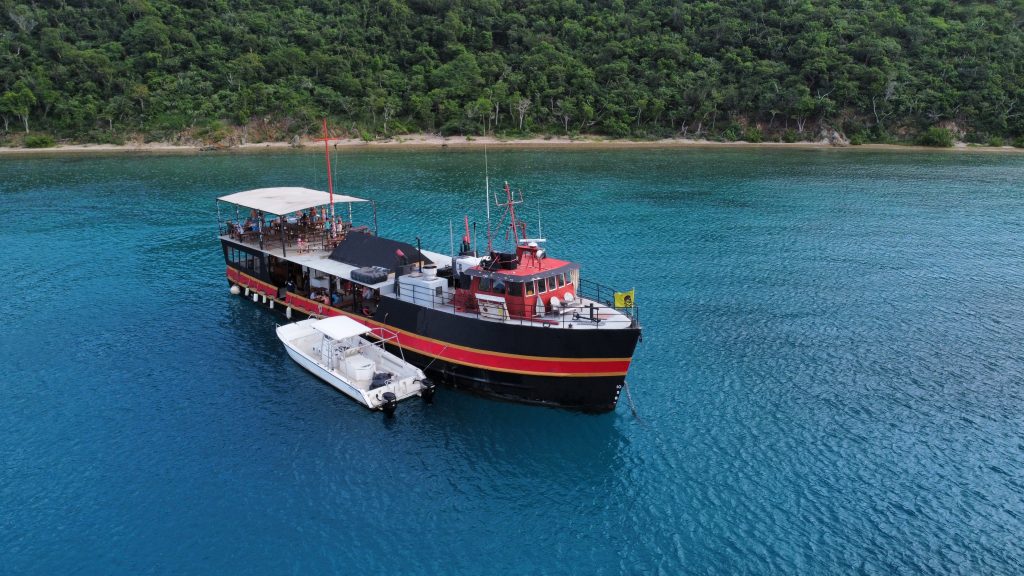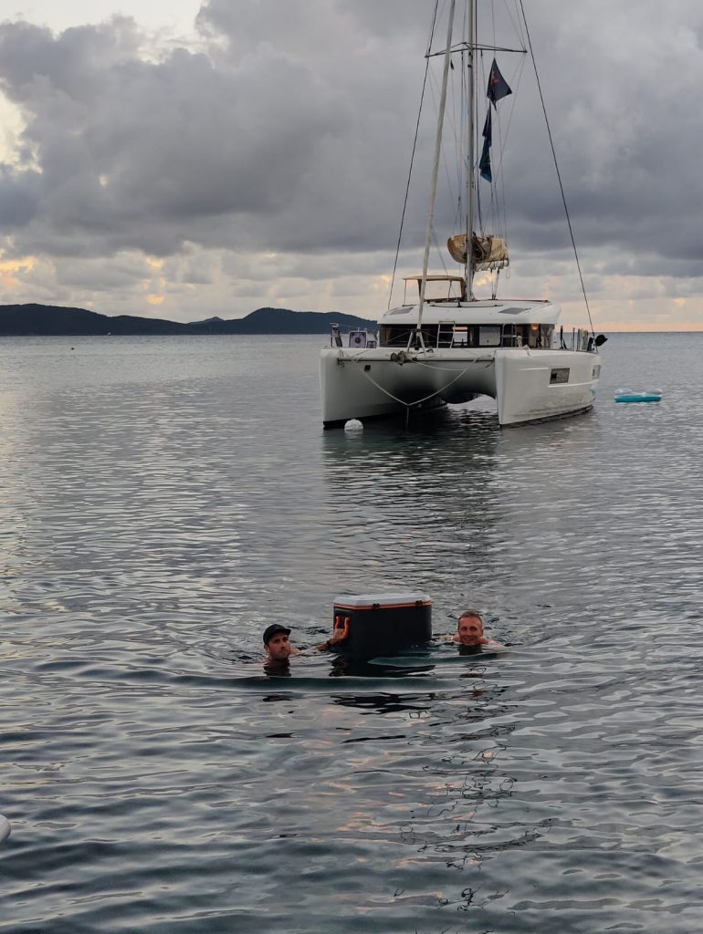 - Once we arrive in the bay, we drop anchor with a shore line before the other boat joins us later.